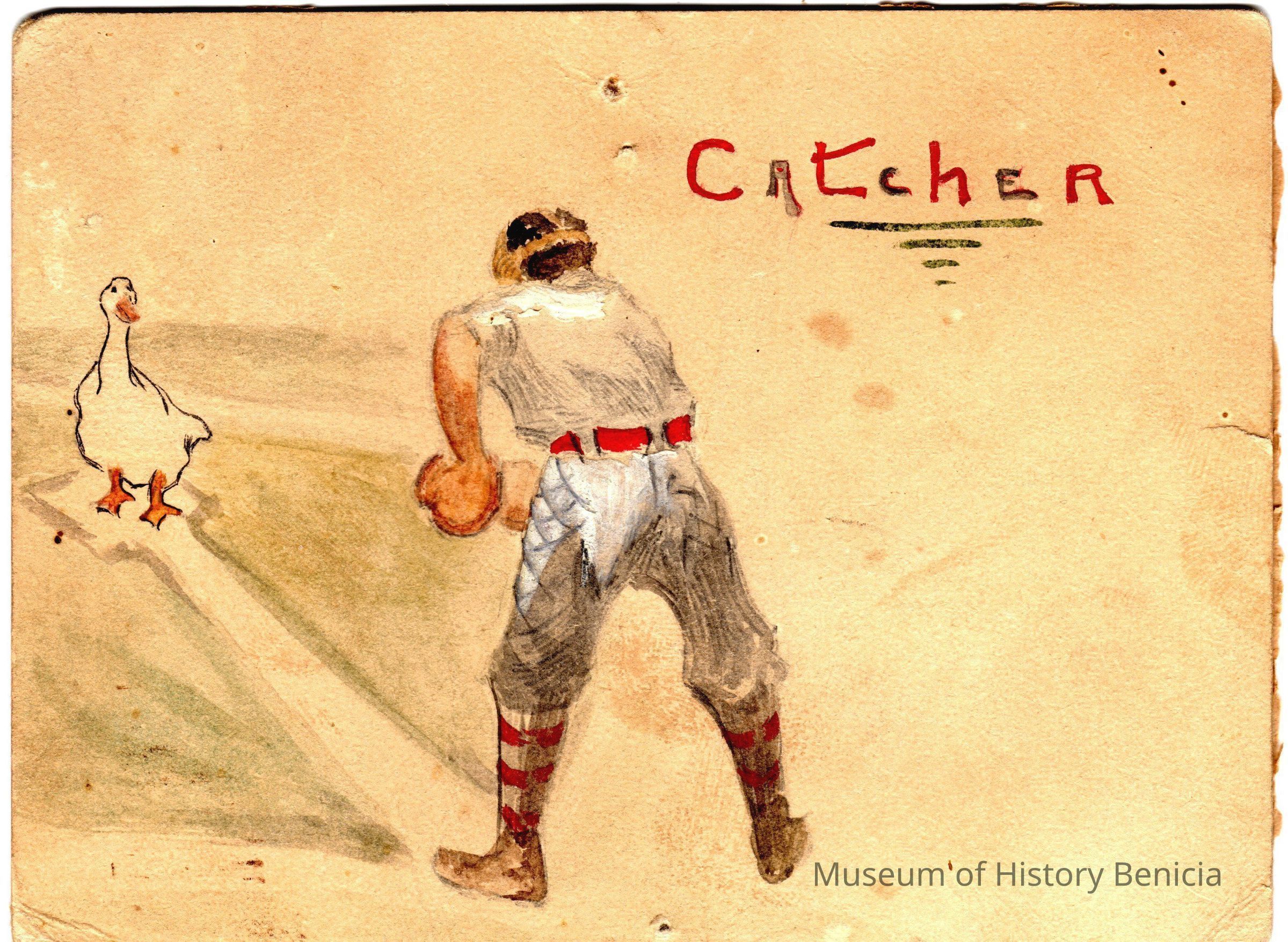 This is the drawing of a catcher and a goose from the scrapbook page 2010.017.0601. It has been removed to protect it from further deterioration. The drawing relates to the newspaper story of Miss Carrie Schnabel promising to cook the Newcastle team a goose dinner if they won. This page is from 1903.One side has a drawing of a catcher and a duck. The other side has a long article about James Malone Jr wounding a criminal.