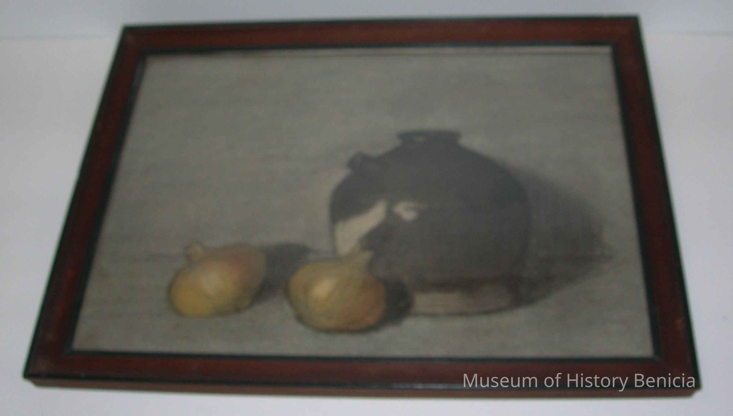 Charcoal still-life of a jug and two onions, no artist's name under glass in a brown with black trim frame