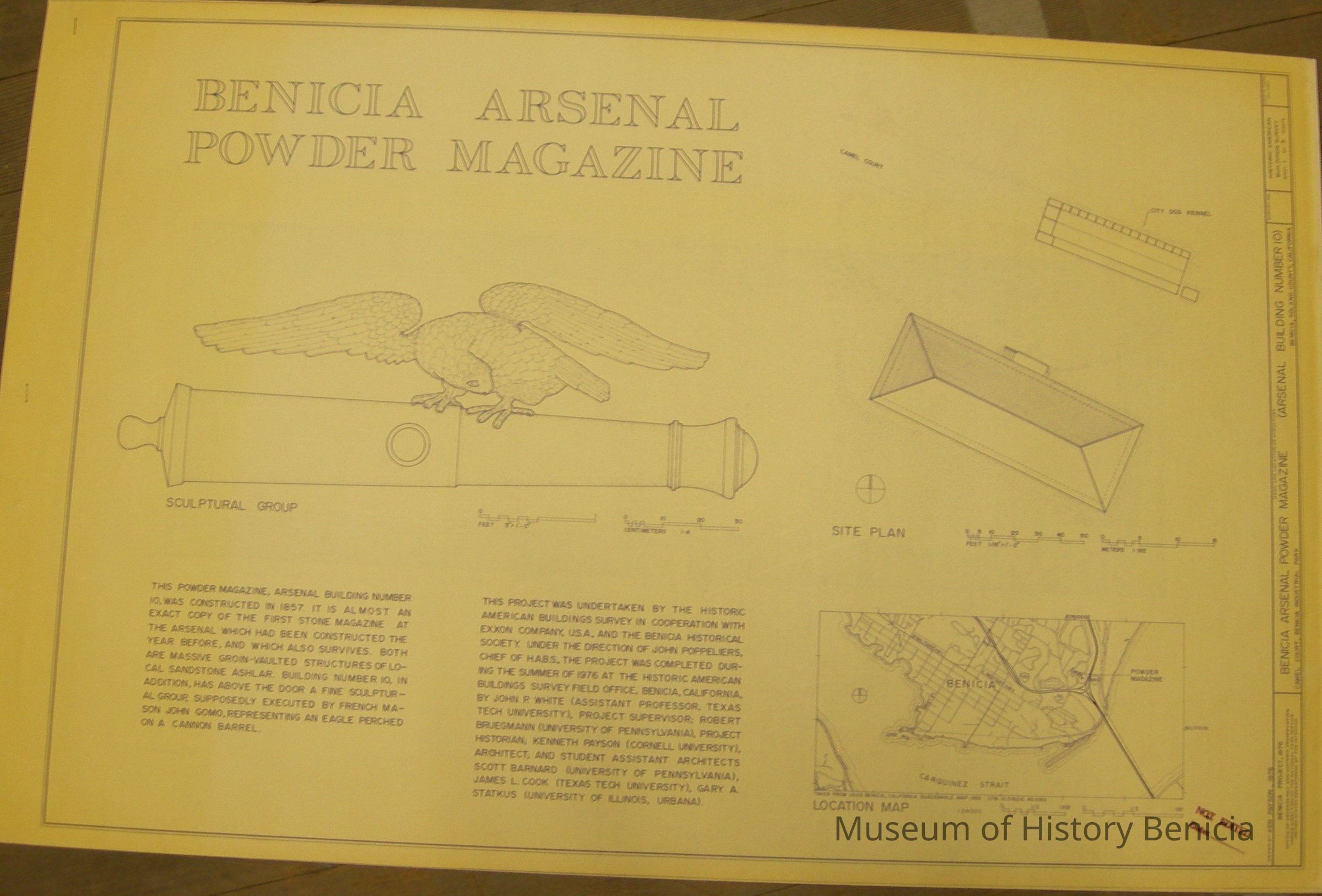 Drawings of the Benicia Arsenal Powder Magazine made by the Historic American Building Survey during its survey of Benicia Arsenal Buildings. Shows the floor plans and elevations. Five sheets in group.