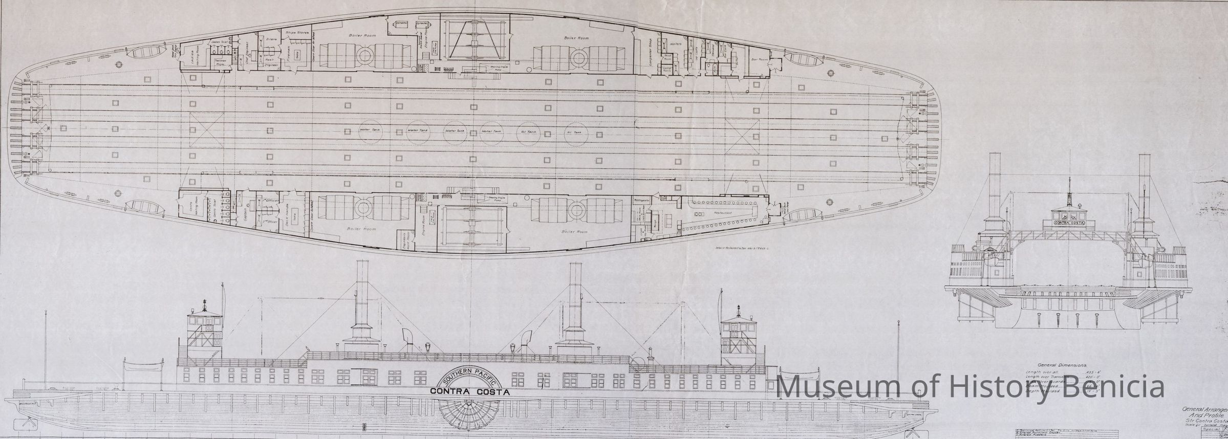Drawing of the Contra Costa ferry. It is a detailed drawing of the technical specifications for the ship. The drawing was made on 05/08/1914 and then was revised 06/07/1915. The ferry was 433 ft 4 inches in overall length and 116 feet in width. The drawing is a 1/8inch = 1 foot.