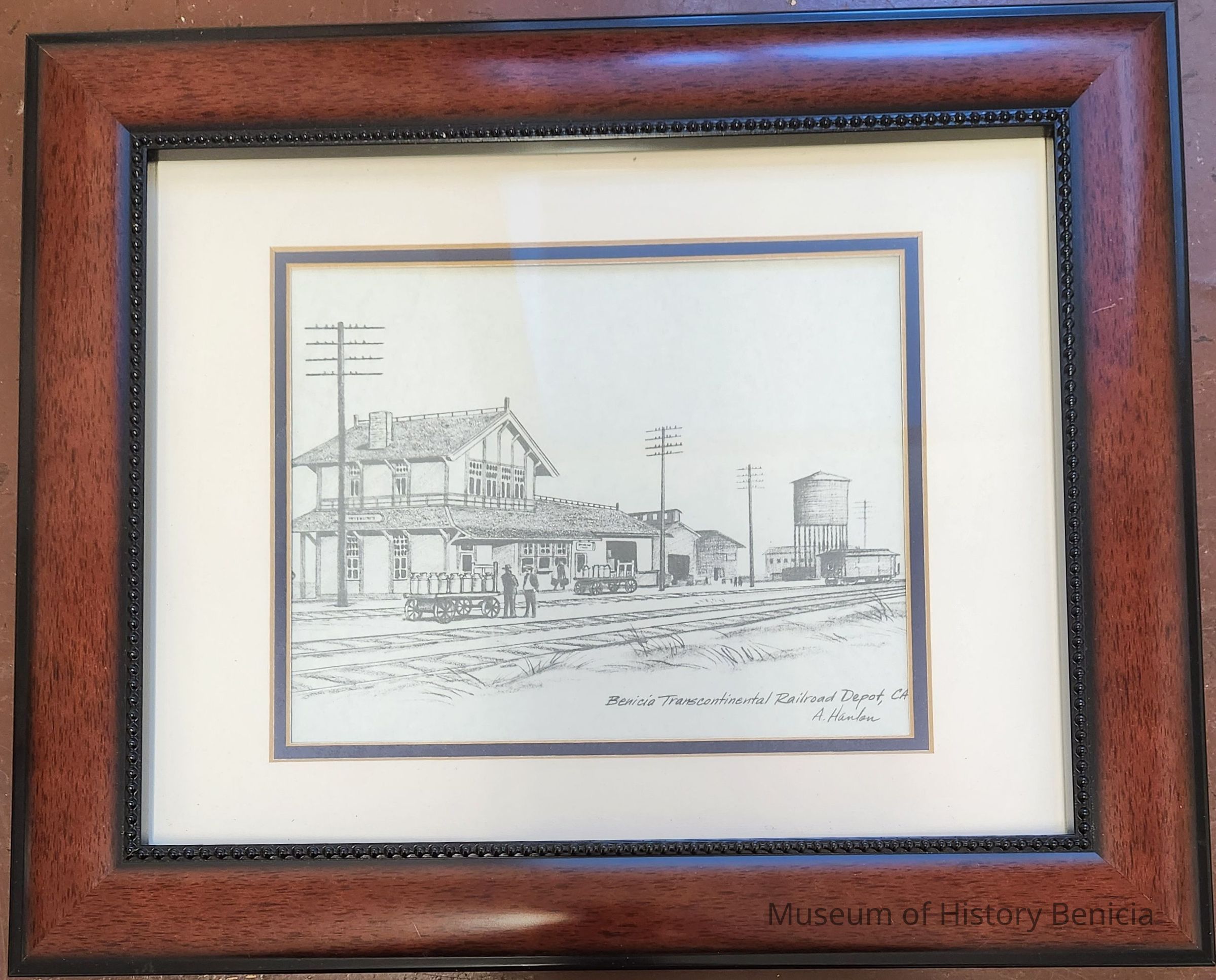 This is a pencil drawing of the Benicia Transcontinental Railroad Depot, and is in a brown wooden frame. Written on bottom right corner is "Benicia Transcontinental Railroad Depot, CA" and "A. Hanlon"Photograph Details
