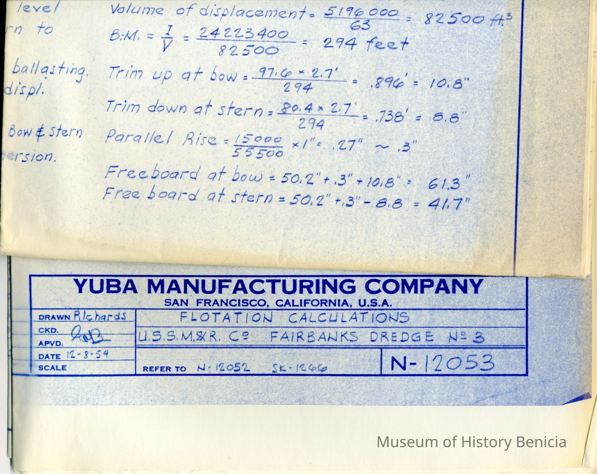 Flotation calculations for U.S. S. M&R Co. Fairbanks Dredge No. 3. Calculations used determine if the completed dredge would float as designed.Collection
