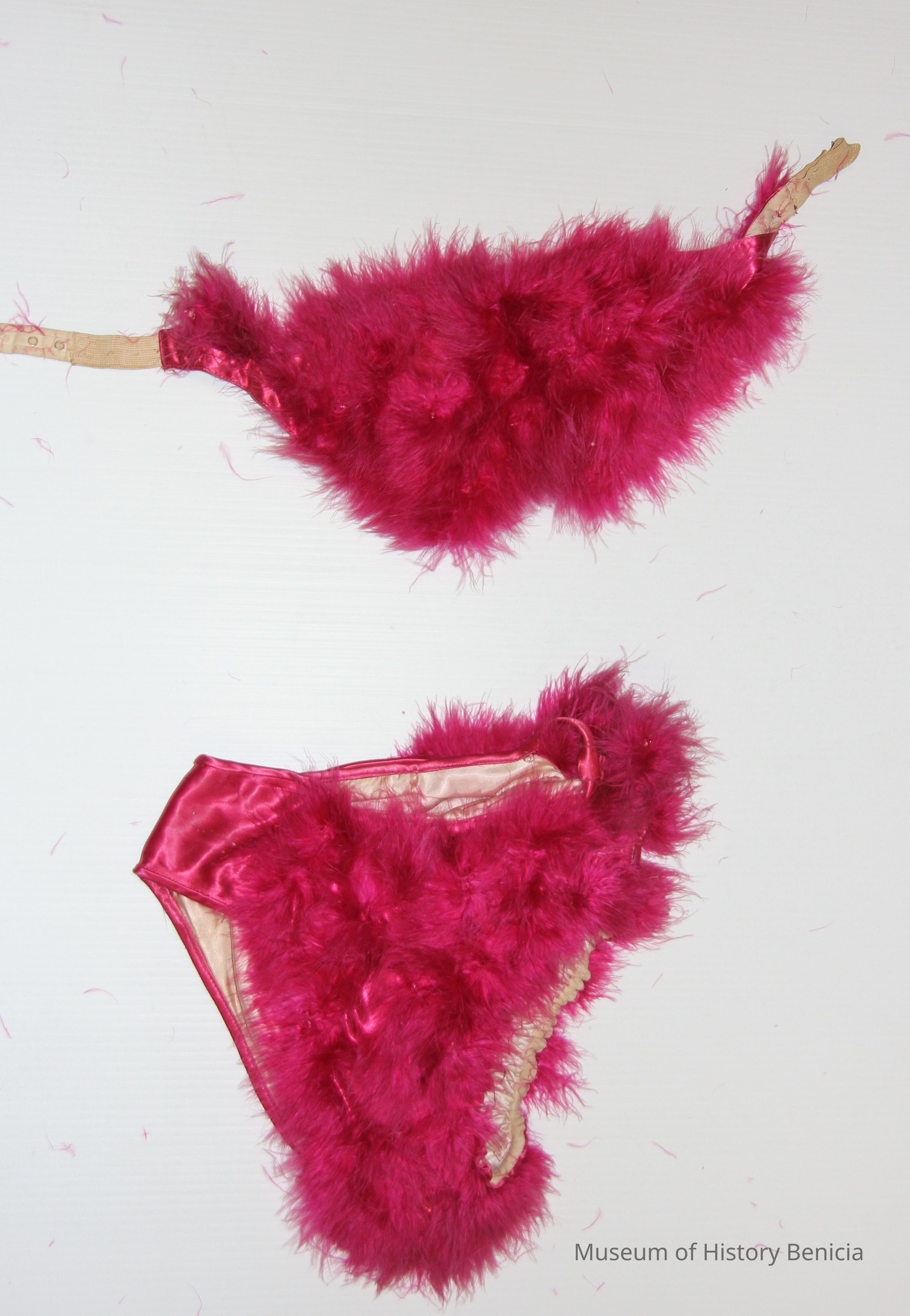 Dress or costume worn by women who worked in Benicia's "red light" district. This costume is a feather covered red material. It is two piece with a bra and "panties"Collection