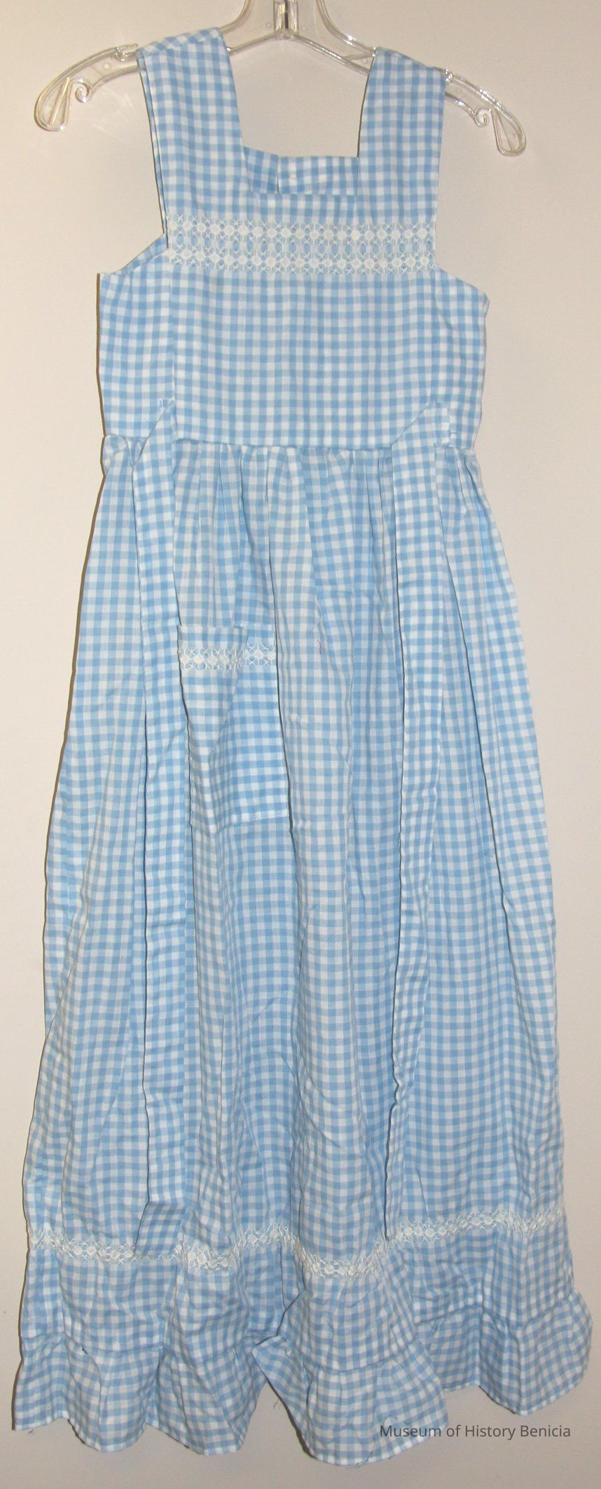 Homemade blue checked gingham pinafore with button back and pocket plus tie.Collection
