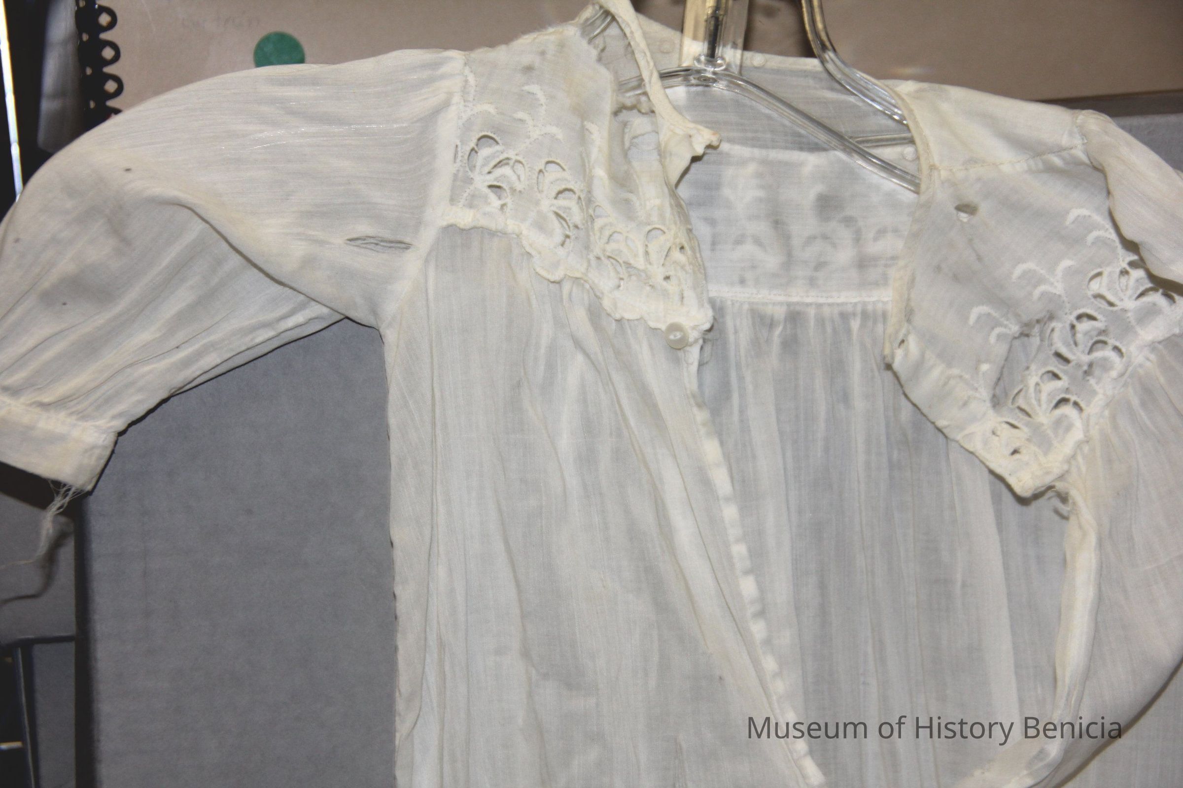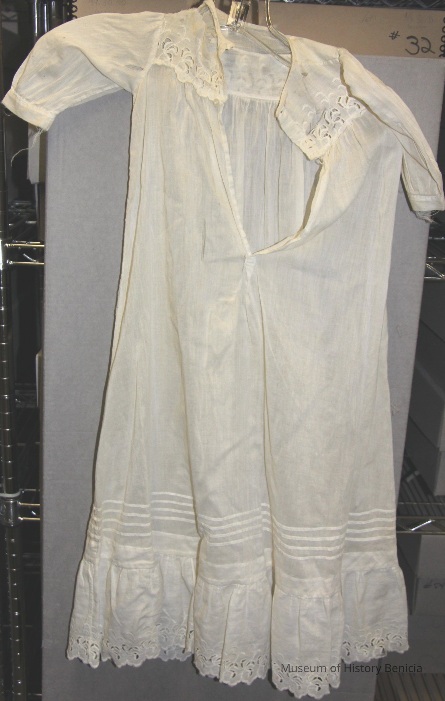 White, long dress eyelet around bottom and yoke. Front has been repaired by the neck. Has short puffed sleeves.ass buttons with lace around bottom. Was worn by donors family members.Collection