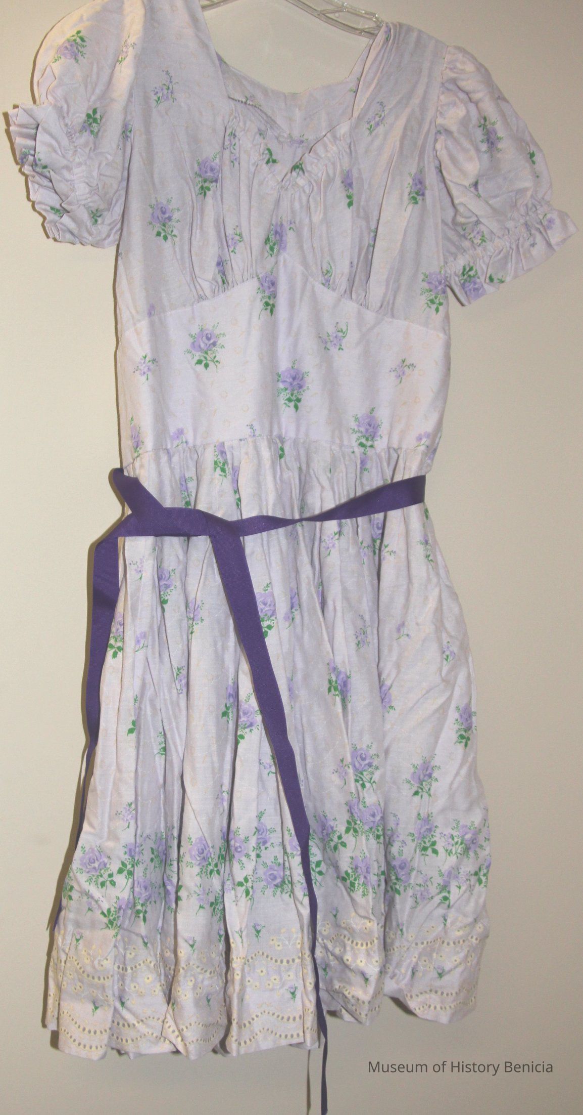 Homemade lilac print dress short puff sleeve side zipper purple ribbon tie eyelet hem.