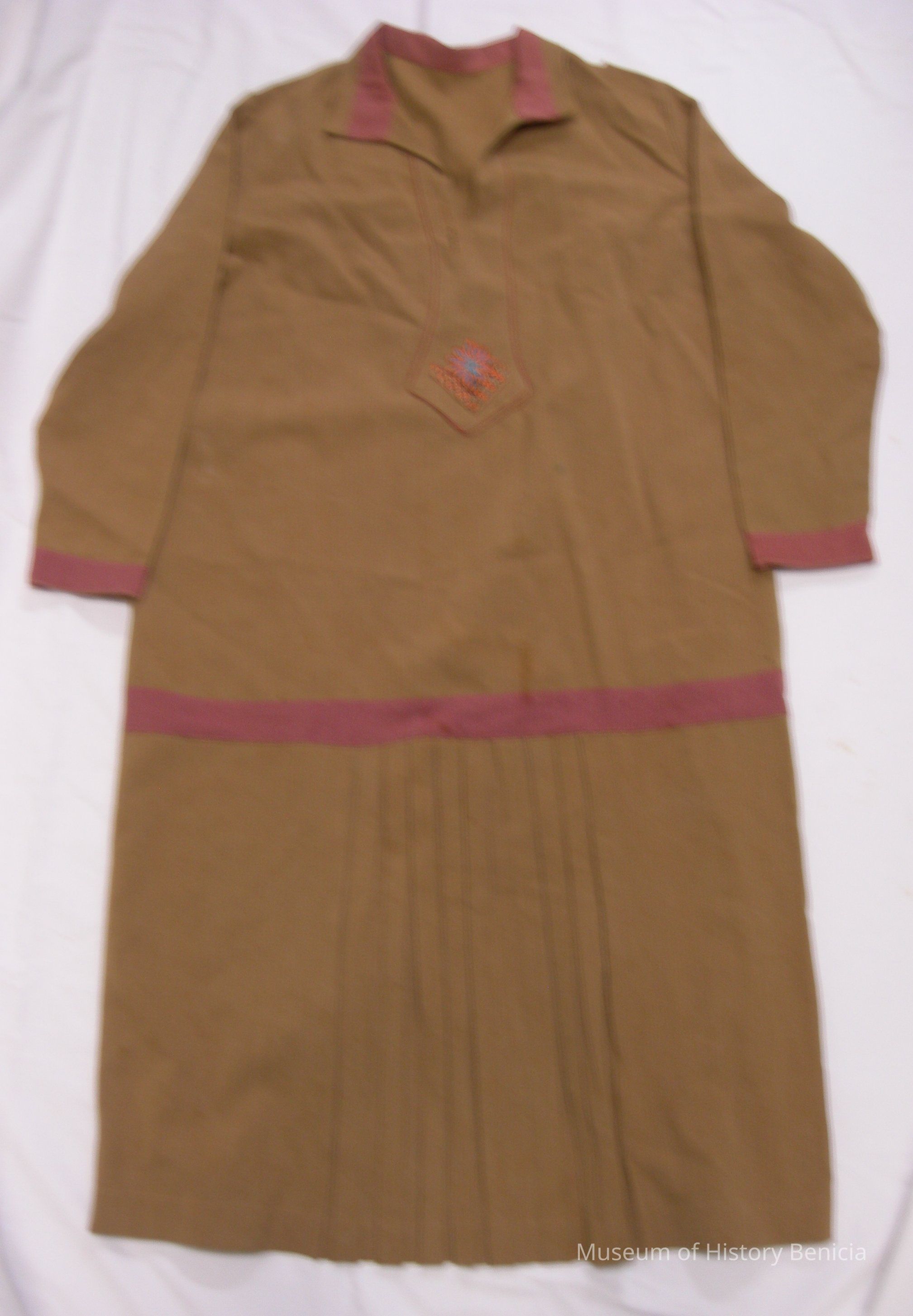 Dress, late 1920's early 1939's; brown, dropped waist, red band on collar and above and around a section of pleats at the lowered waist and on the cuffs of the long sleeves; the placket around the neck and down the front has an embroidered detail (orange and torquoise); it could be a cotton/wool combination.