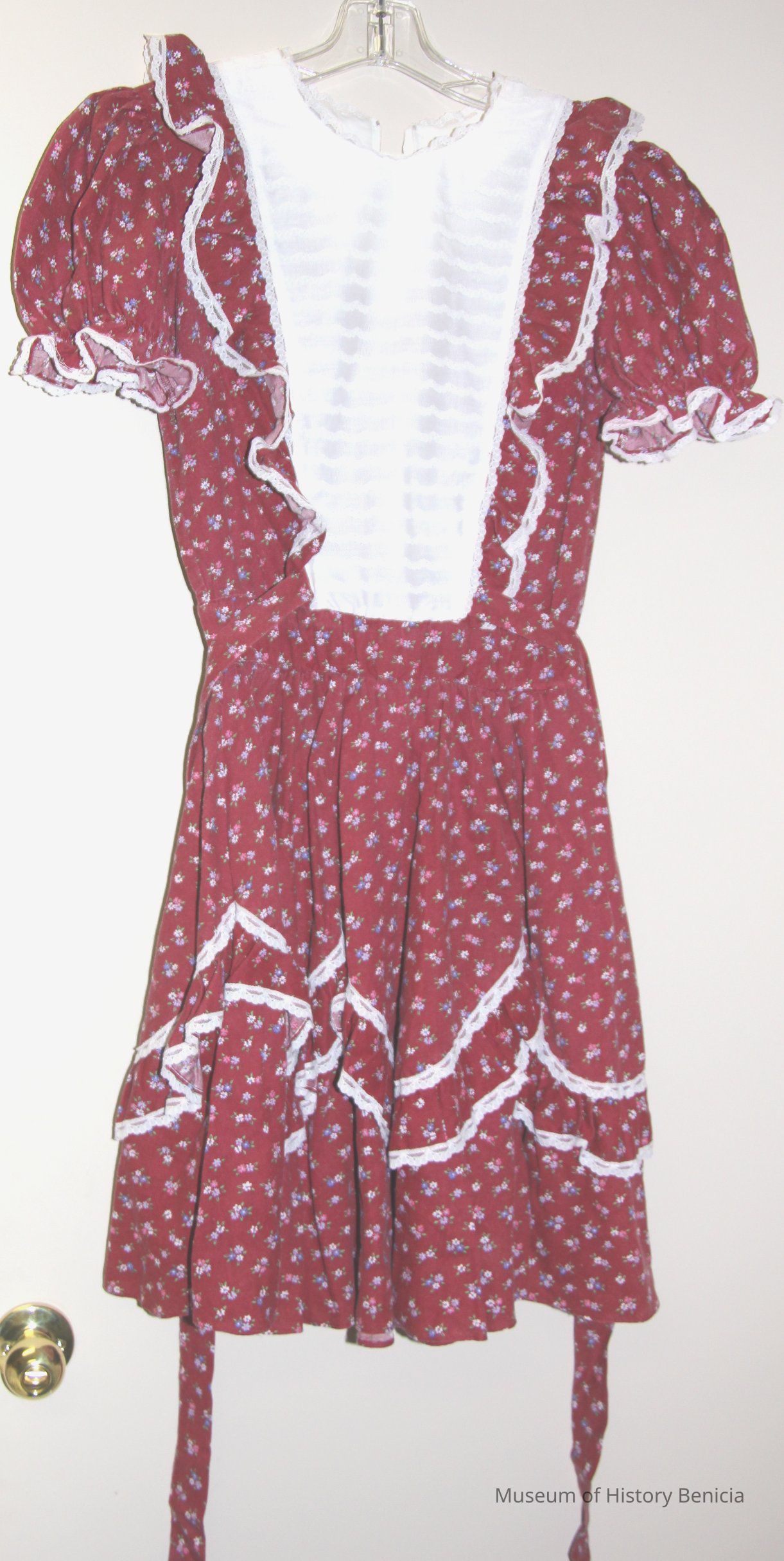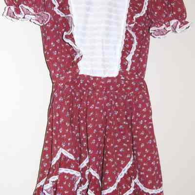 Commercial made (Partner Please) maroon floral print with gathered short sleeves, white yoke front panel, lace decoration, back zipper, selftie,Collection