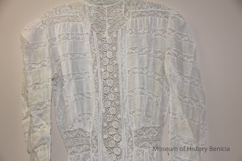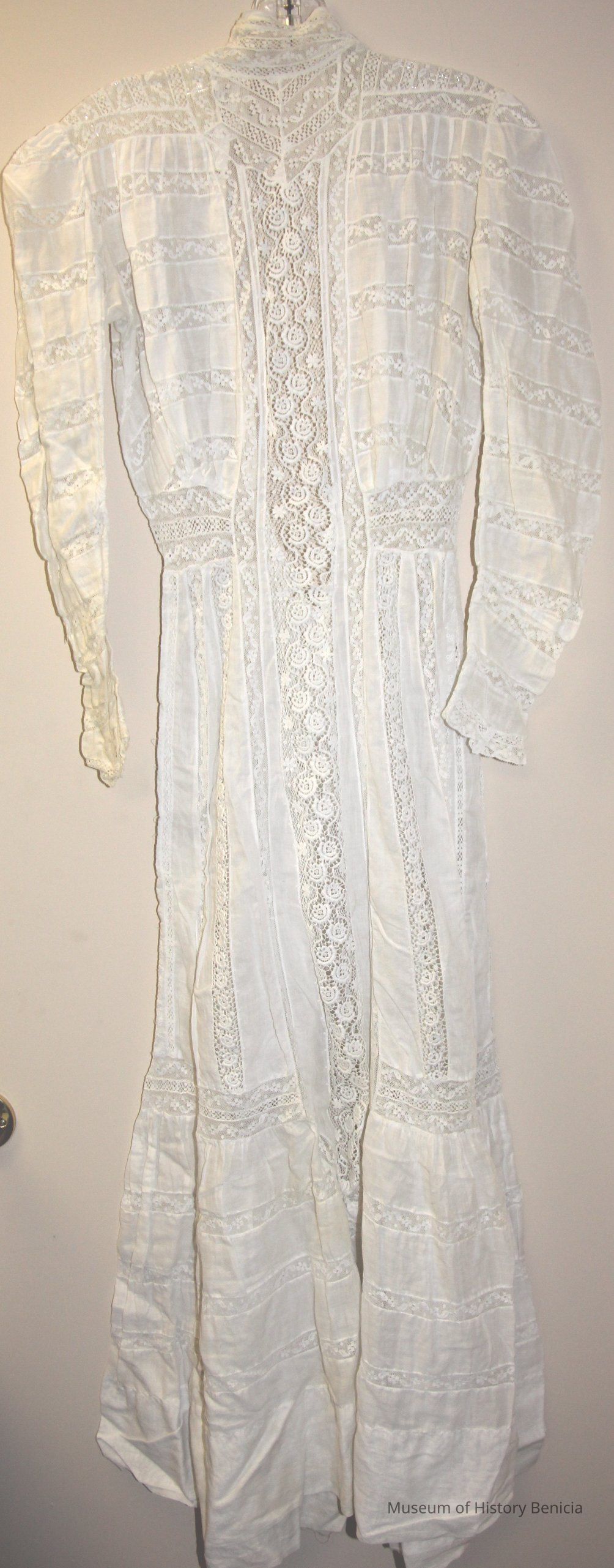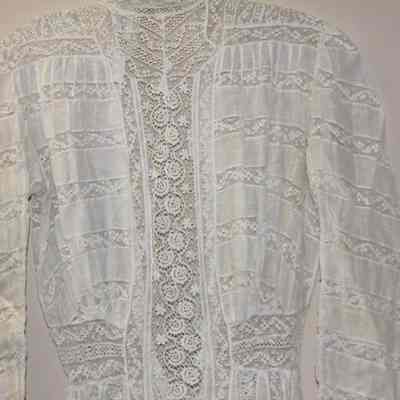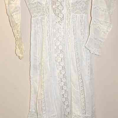 White cotton dress plain weave fabric and lace , long sleeves, high collar, button back