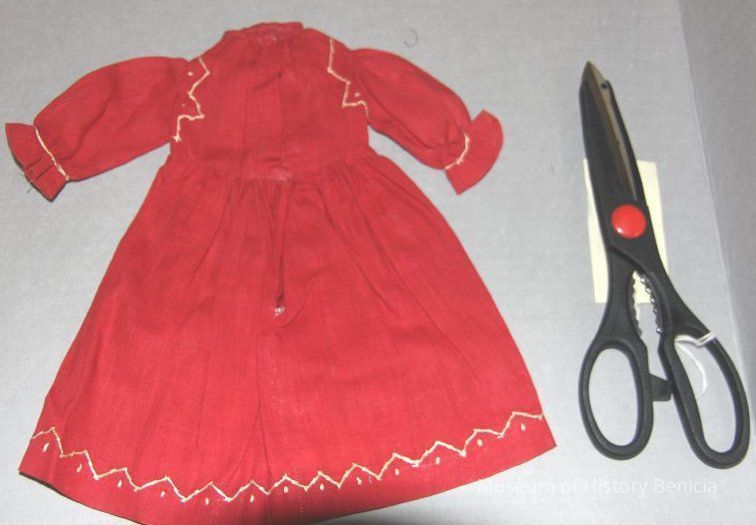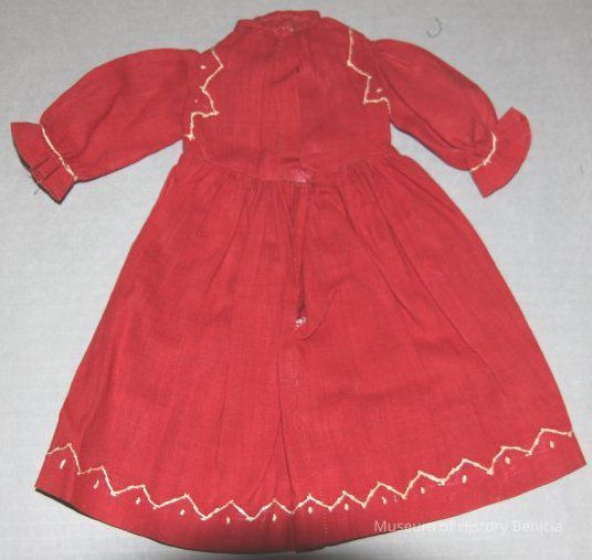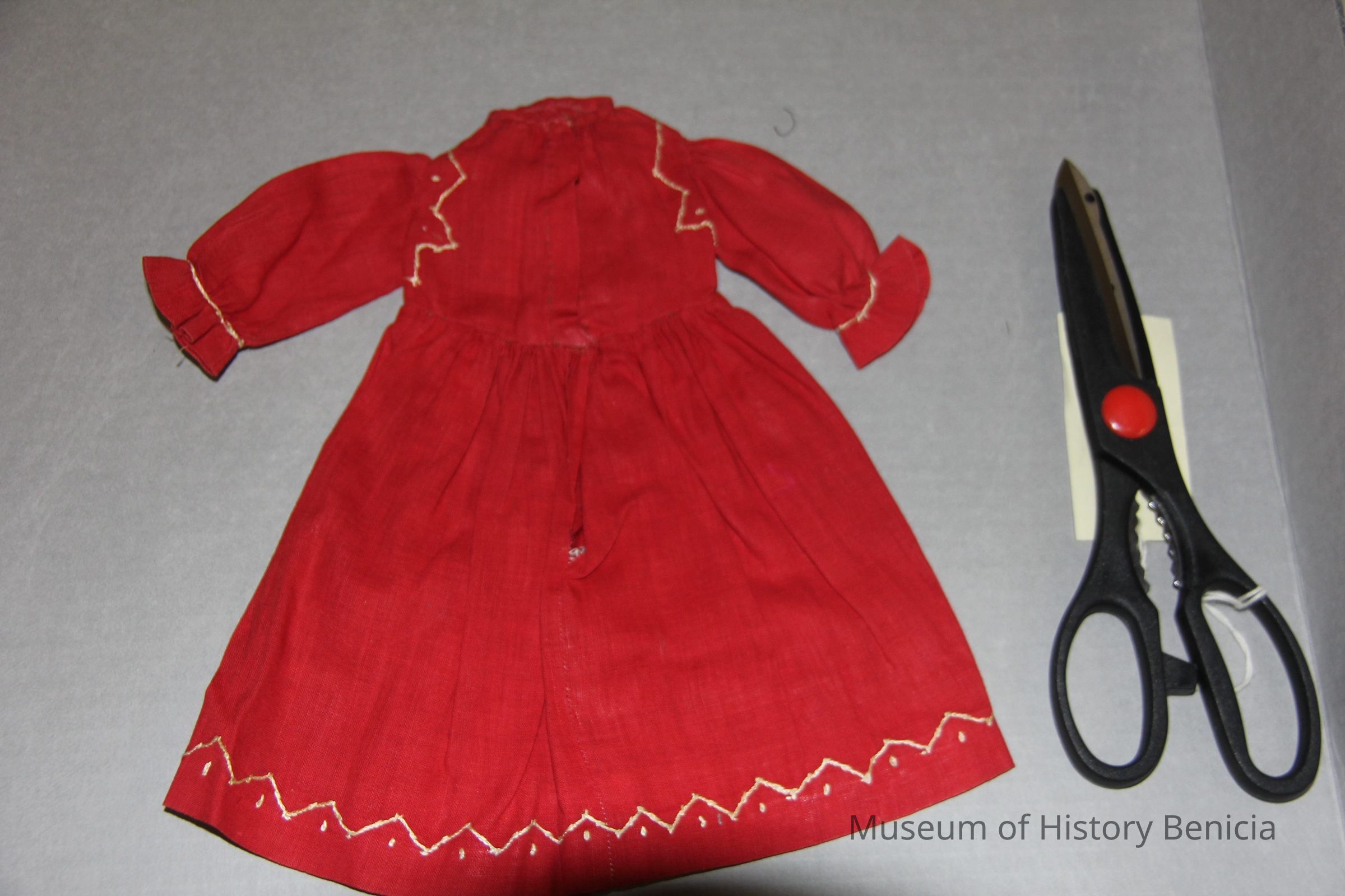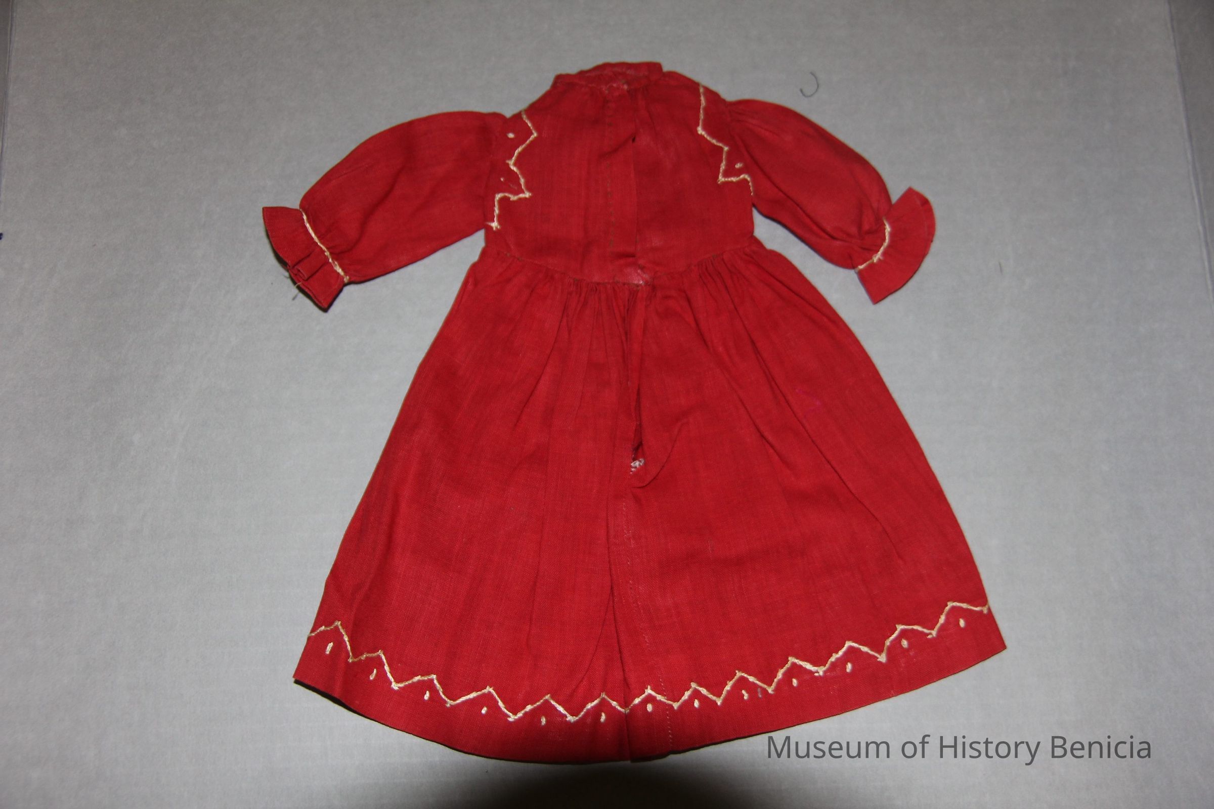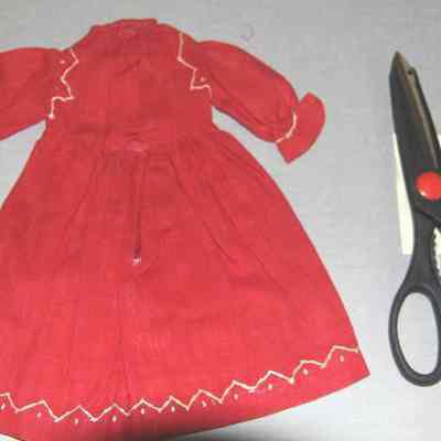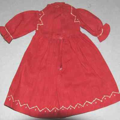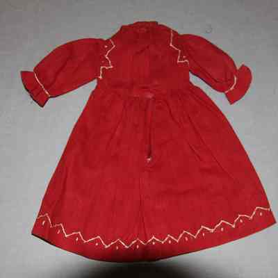 Small red dolls dress with off-white stitching around bottom, cuffs and top.