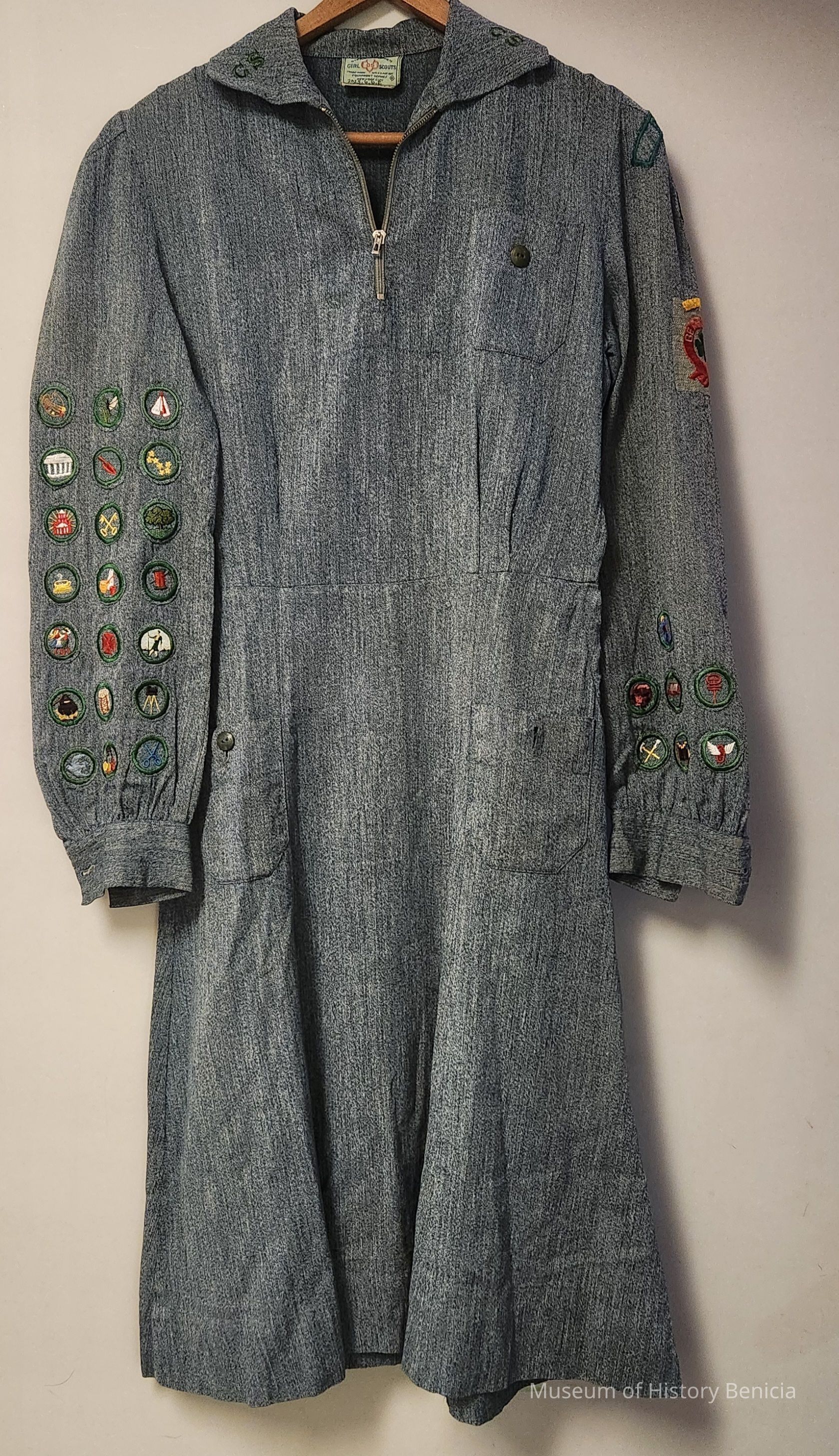 Girl Scout Uniform Dress (1940s) that has a collar with a 6" front zipper closure; There is a "GS" on each side of the collar. There is a pocket with a button on the left breast. There is a side zipper. There are two pockets with buttons on either side of the front of the skirt. It is tweed cloth in a dull bluish green. It has long sleeves. On the right sleeve there are 21 small, round, sewn-on badges. On the left sleeve (top to lower edge) are a "Benicia" patch, "6" patch, "Be Prepared" patch, and seven small, round sewn-on badges.Collection