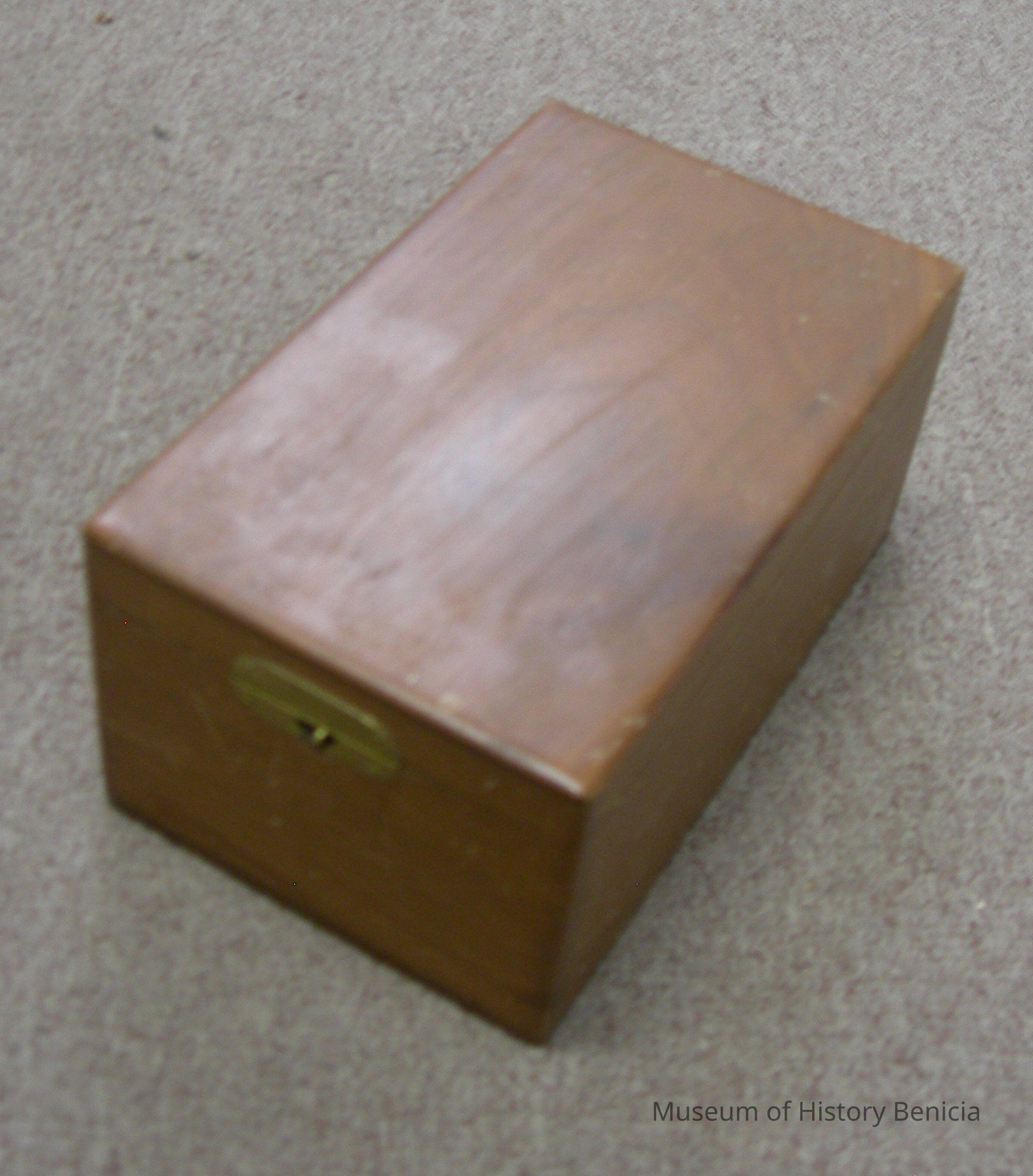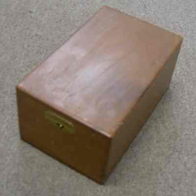 In a brown wooden box: 4-1/2" x 7-3/4" x 3-3/4", has small switch lock,