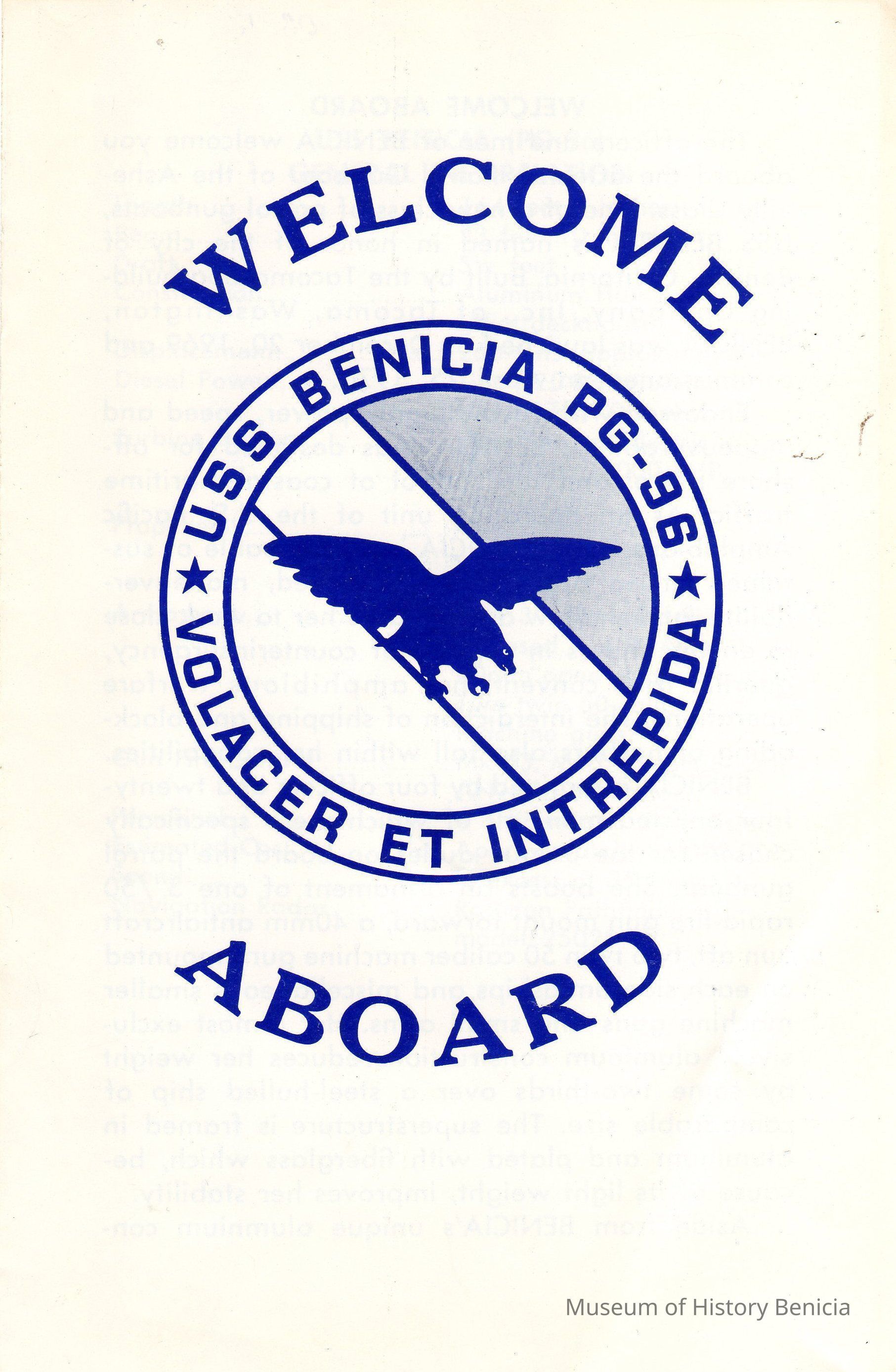 Trifold brochure titled "Welcome Aboard"; contains information about the ship and was used for tours (mostly by civilians). This brochure was probably obtained when the USS Benicia PG-96 visited the City of Benicia in May 1970. Blue ink on white slick-coated background, photo of the ship is included on one page.Collection
