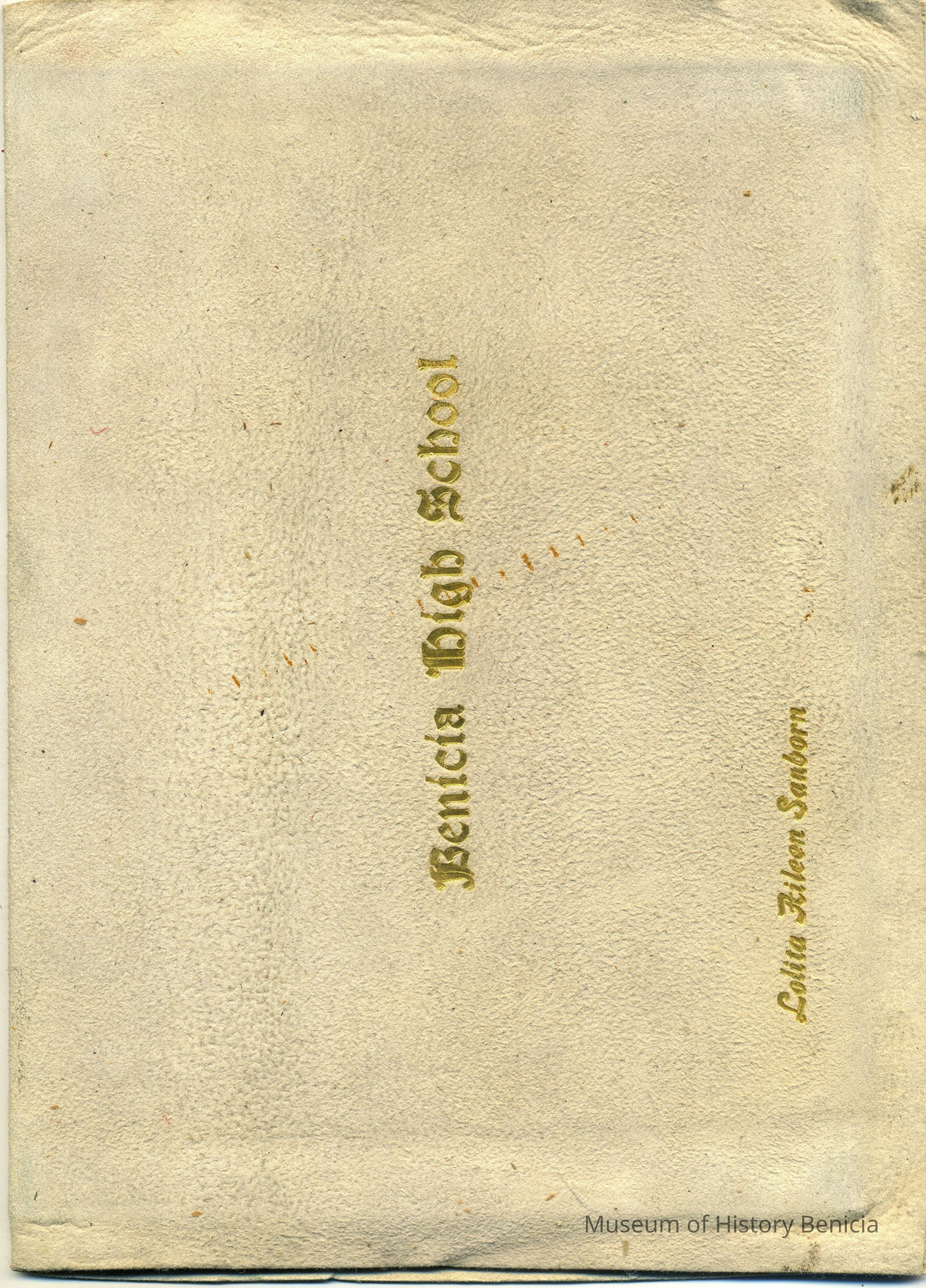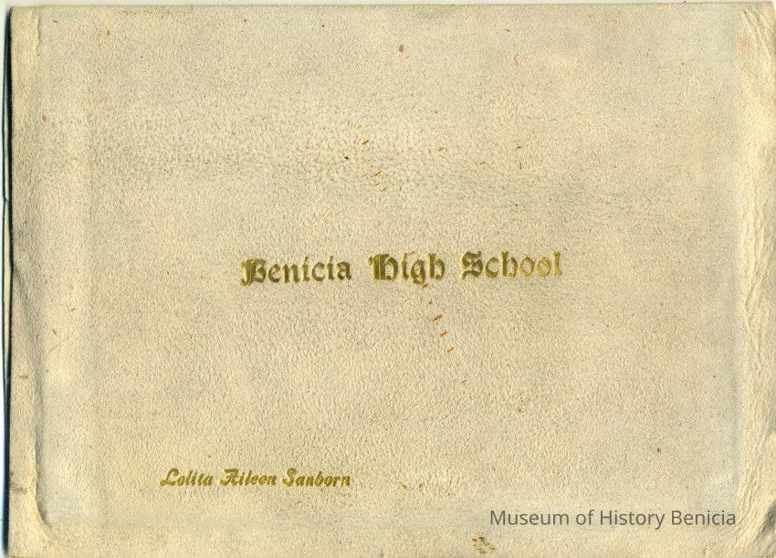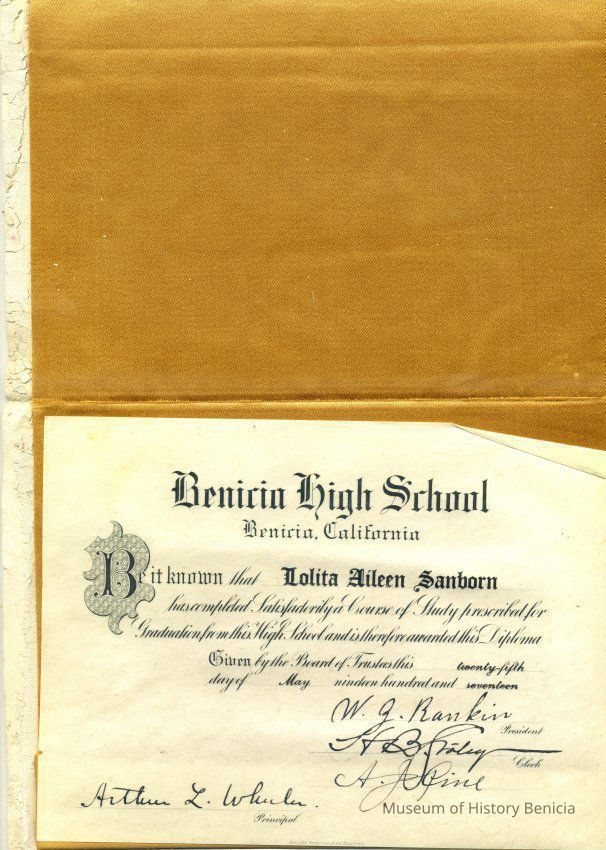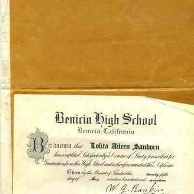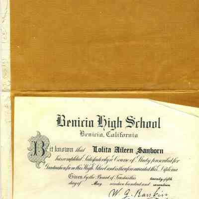This is a diploma for Lolita Aileen Sanborn from high school in Benicia schools. It is in a white velvet holder with "Benicia High School " stamped in gold on the outside along with the student's name.Collection