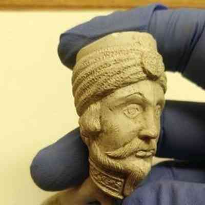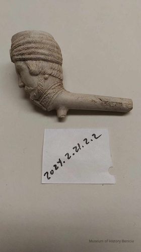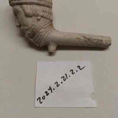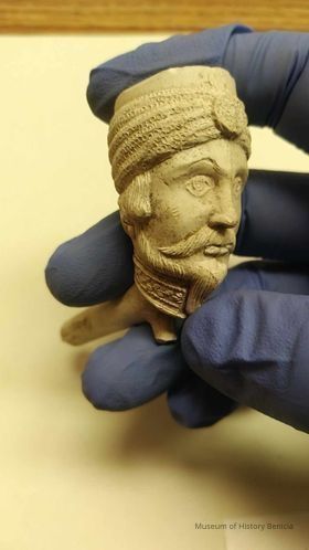 Clay Pipe with figural bowl and partial stem. Stem has makers marks partial makers marks on both sides - appears not to have been smoked