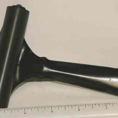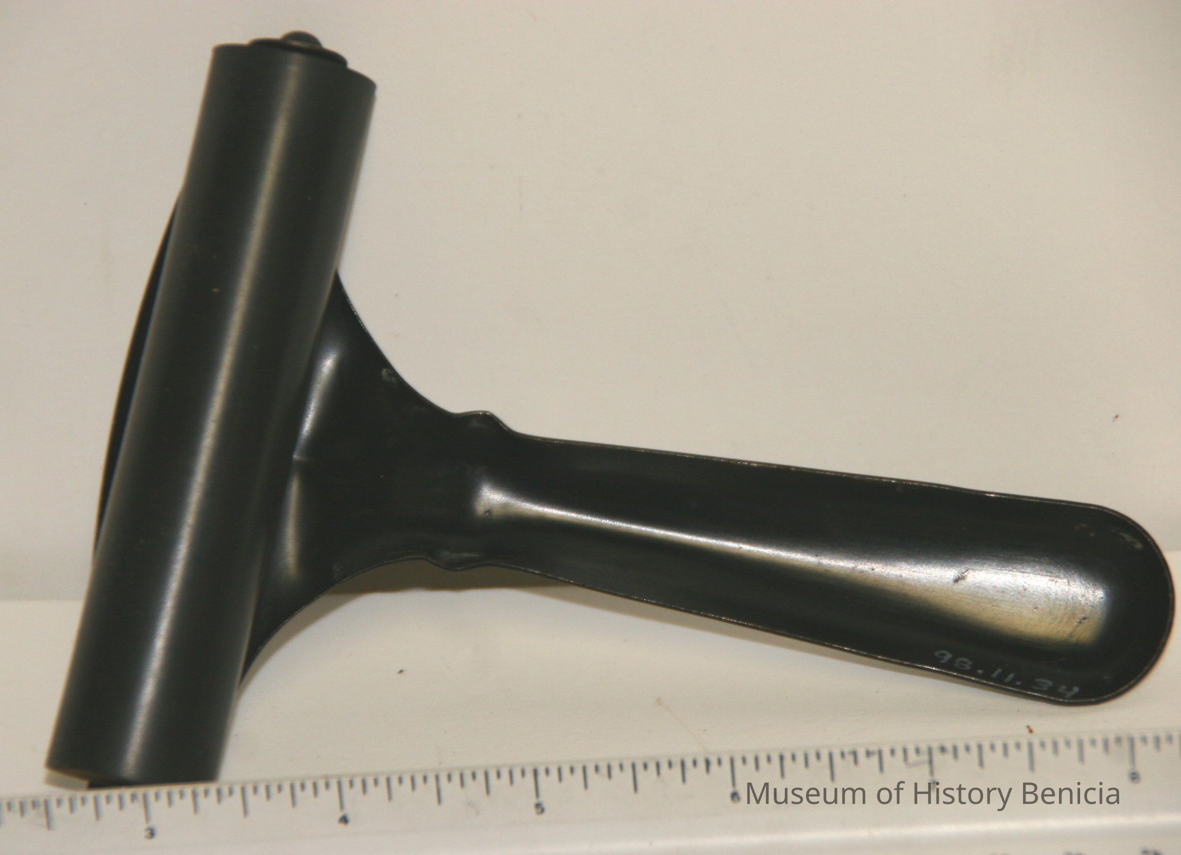 Metal handled roller with rubber coated wooden roller. No maker mark.
