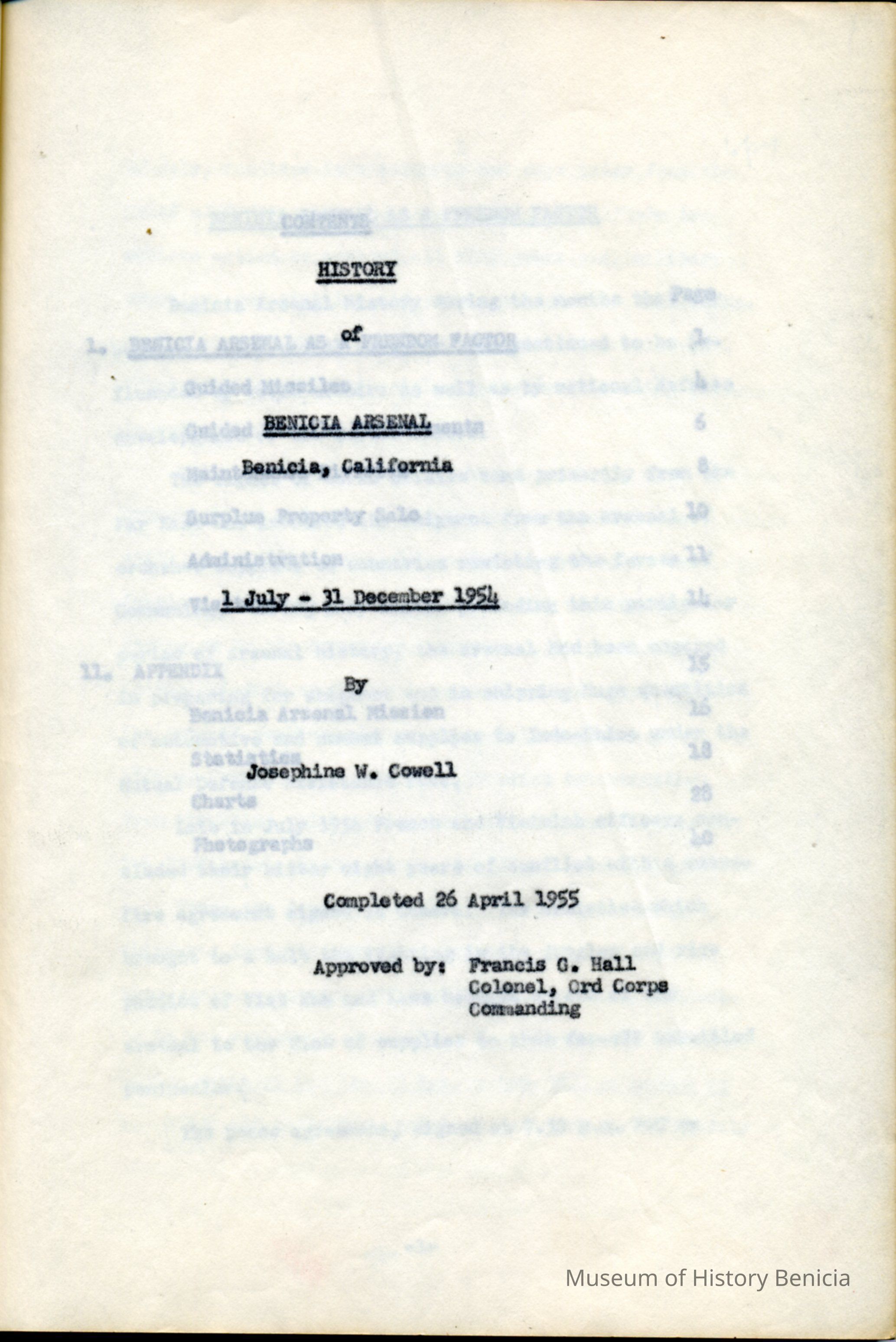 Book on the Benicia Arsenal for the period 07/01/1954 to 12/31/1954. It was written by Josephine W Cowell who has written other books on the Benicia Arsenal history. This book was written with the permission of Francis G. Hall, Col. Ordance Corps Commanding. It contains several photos of Nike Missles, aerial views and the classic picture of Josephine Cowell in Magazine 10 taken in 1954.
