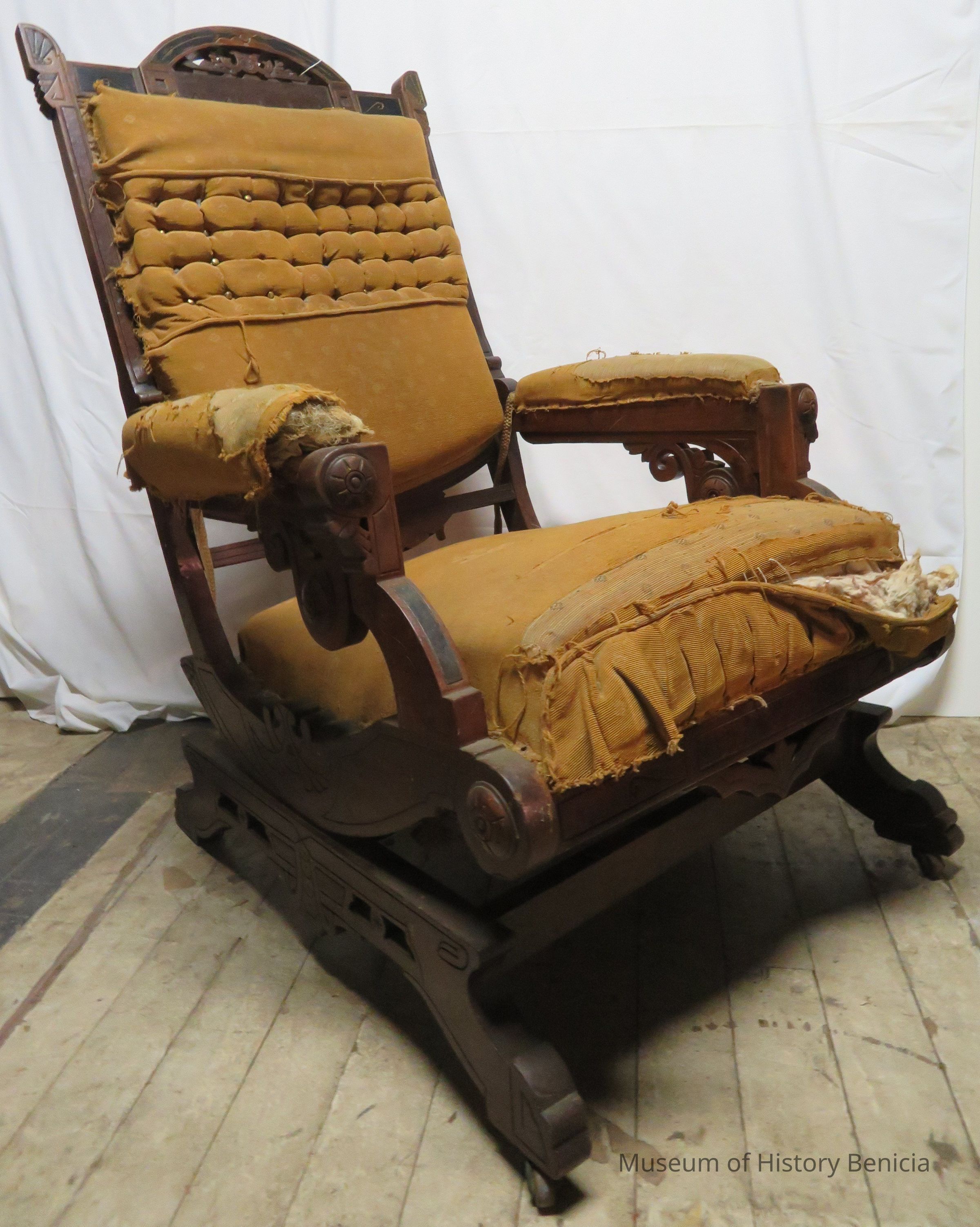 This is from East Lake style. Antique rocking chair with a fine-ribbed fabric gold in color. It is made of dark walnut wood.