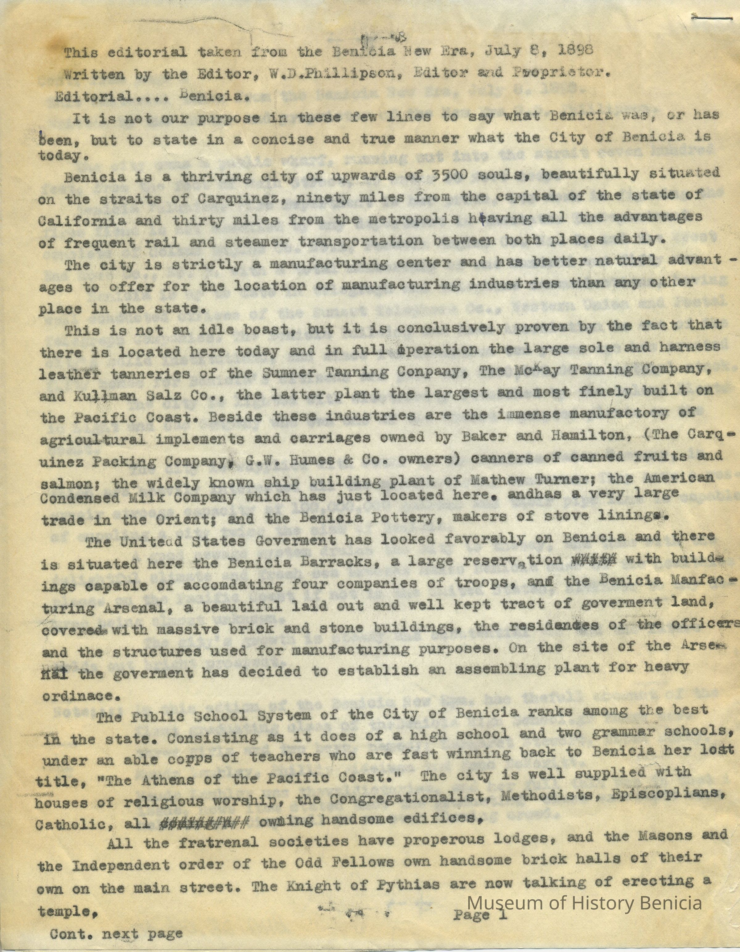 thriving city of upwards of 3500 souls; rail and steamer transportation available; manufacturing center; discusses some businesses; Benicia Arsenal; Pubic School System, Religion; Fraternal Societies; Fire & Police; Utilities