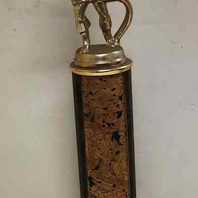 Trophy - wooden base; column: gold metal-brown metal with gold/brown insert-fireman figure with a hose is on top.
