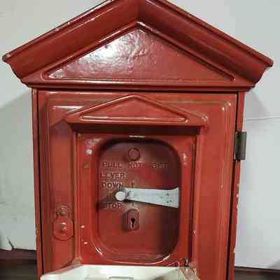 Gamewell Auxiliary fire alarm box for municipal or plat fire alarm box connected to alarm system at central receiving station. On front: "Fire Alarm Station / The Gamewell Co. / Newton Mass". Inside: "Pull lever down to stop". In white on the handle: "Pull handle"; on white plate "Then Pull Down Lever". There is a keyhole to get to the inside of the box under a sliding cover.Collection