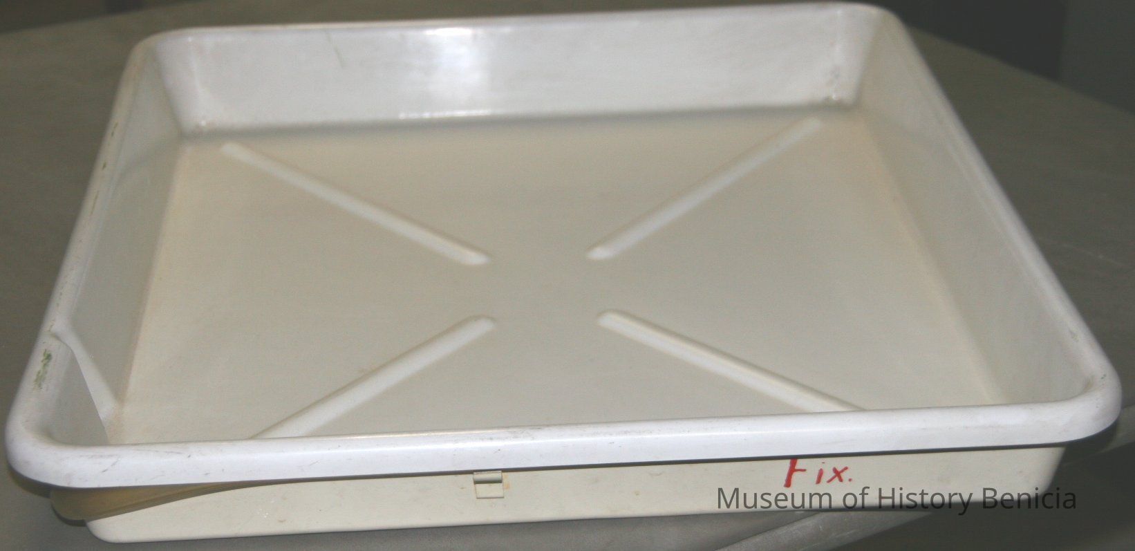 Large (16X20") developing tray identified for "fixing" the print. Color white.