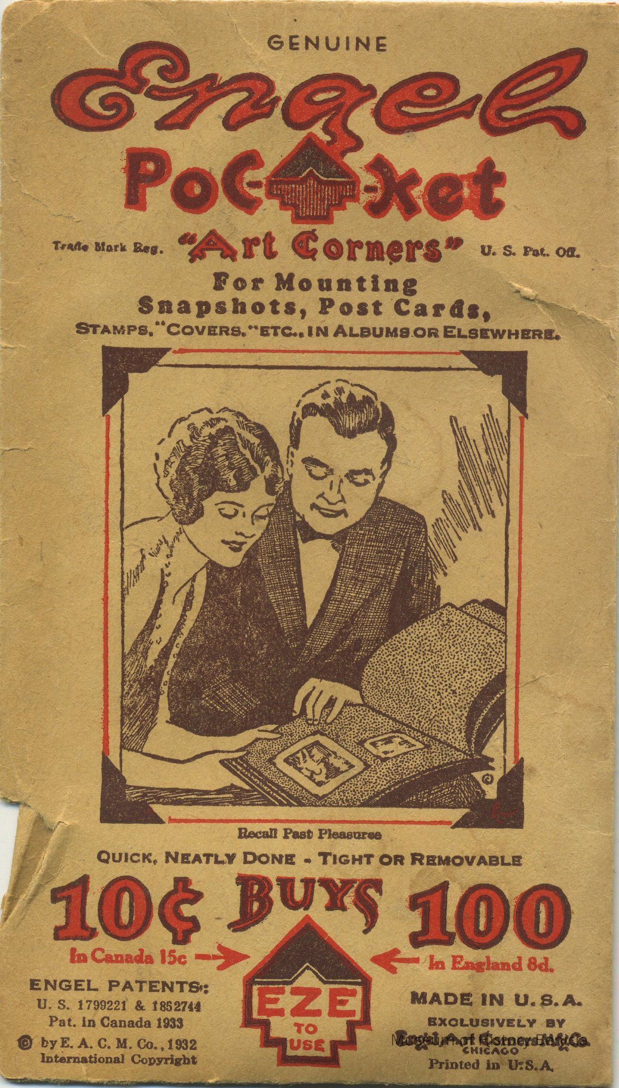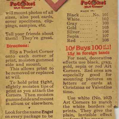 "Genuine / Engel / Pocket / "Art Corners" / for mounting snapshots, postcards / stamps, "covers" etc in albums or