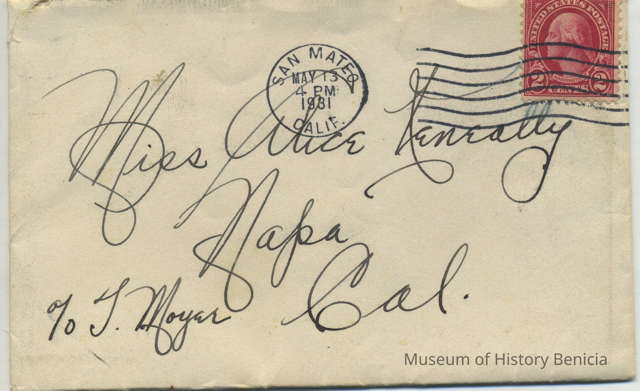 Envelope addressed to Miss Alice Keneally / Napa / Cal. / c/o T. Moyer;