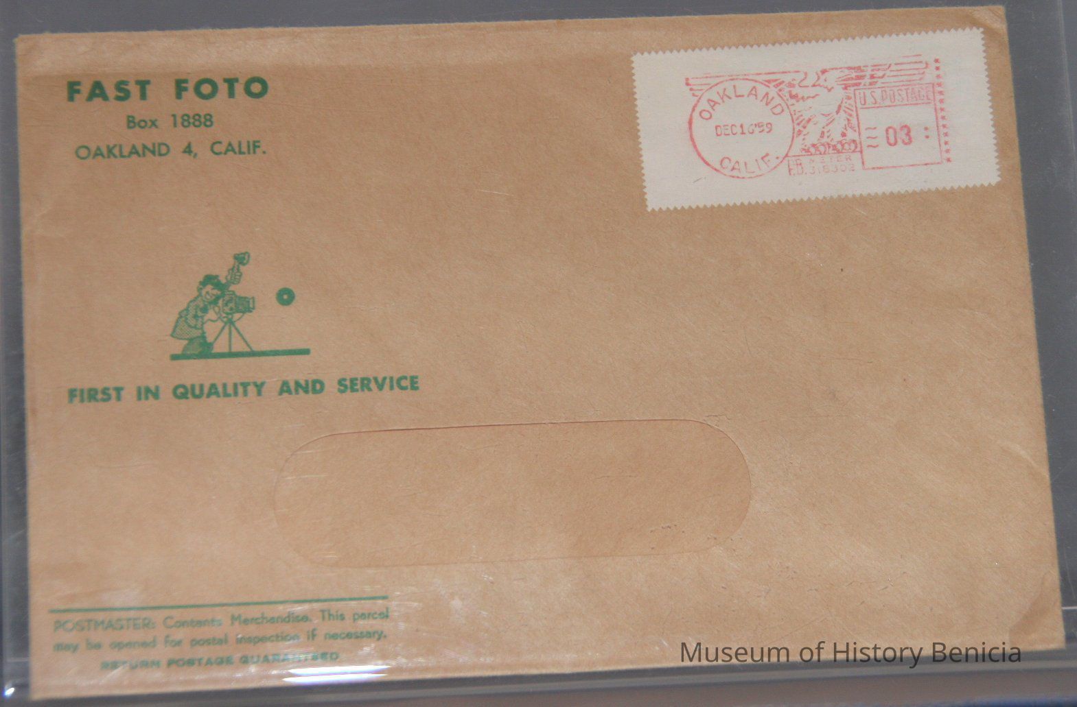 Brown envelope from "Fast-Foto" Oakland, CA. Also stamped Dec. 16, 1959. OaklanCA $.03