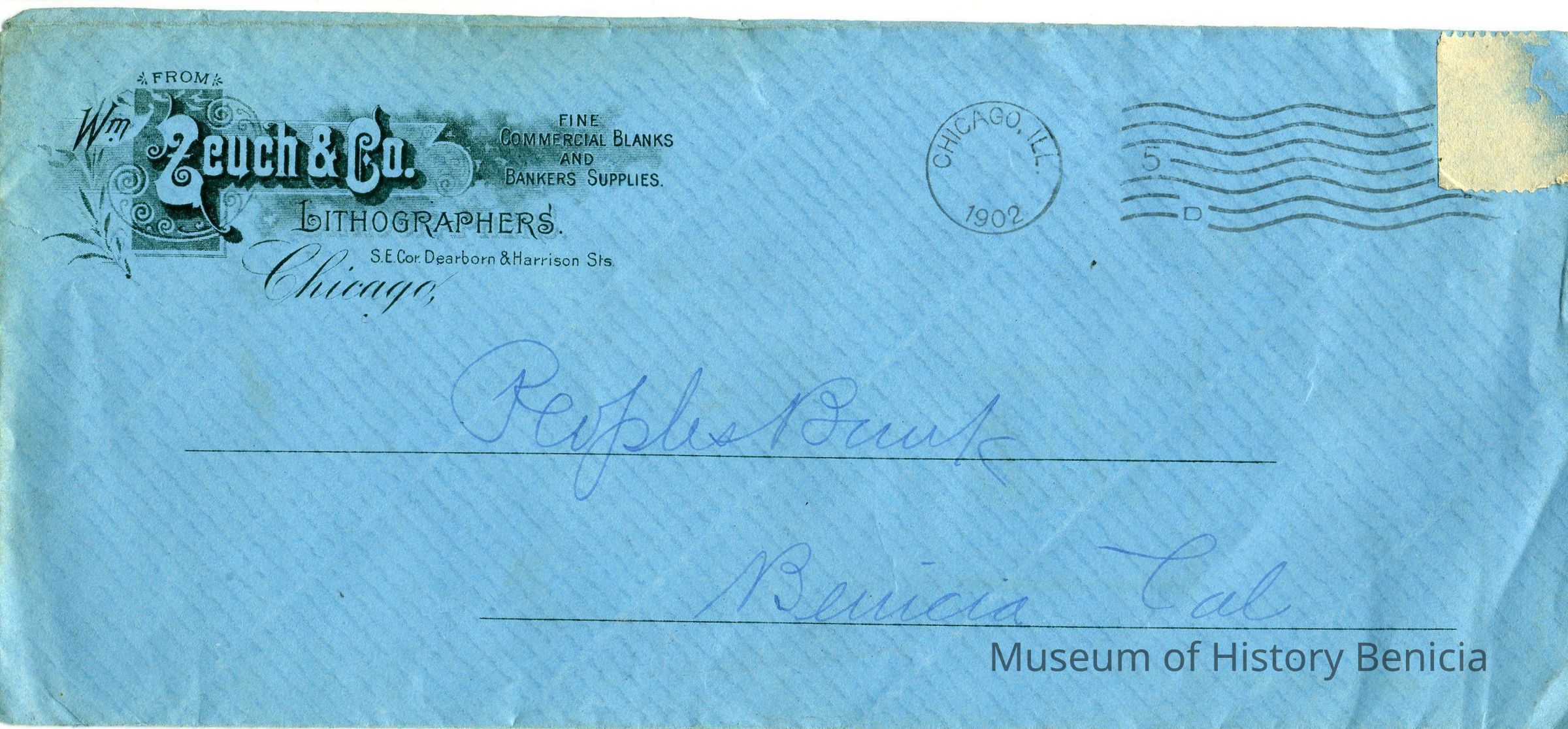Envelope - blue, legal size, addressed to People's Bank Benicia Cal.; Return address printed in black ink: