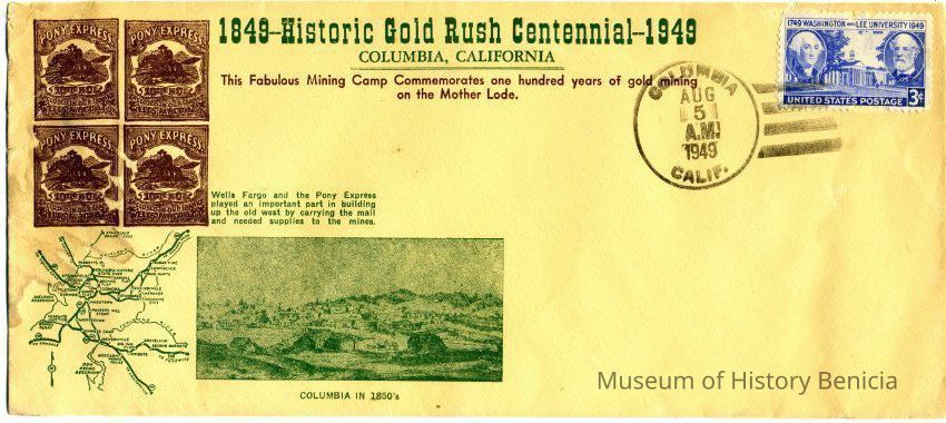 Upper left has printed Pony Express "stamps" with the caption "Wells Fargo and the Pony Express played an important part in building up the old west and carrying mail and needed supplies to the mines." Lower left has map of Columbia area and image of Columbia in 1860s.Collection