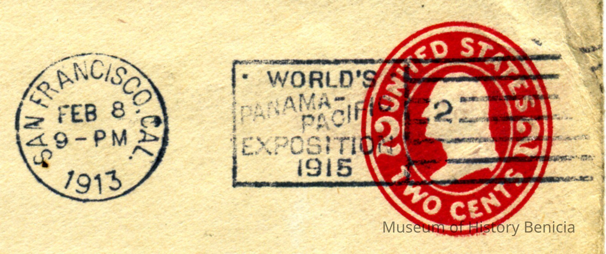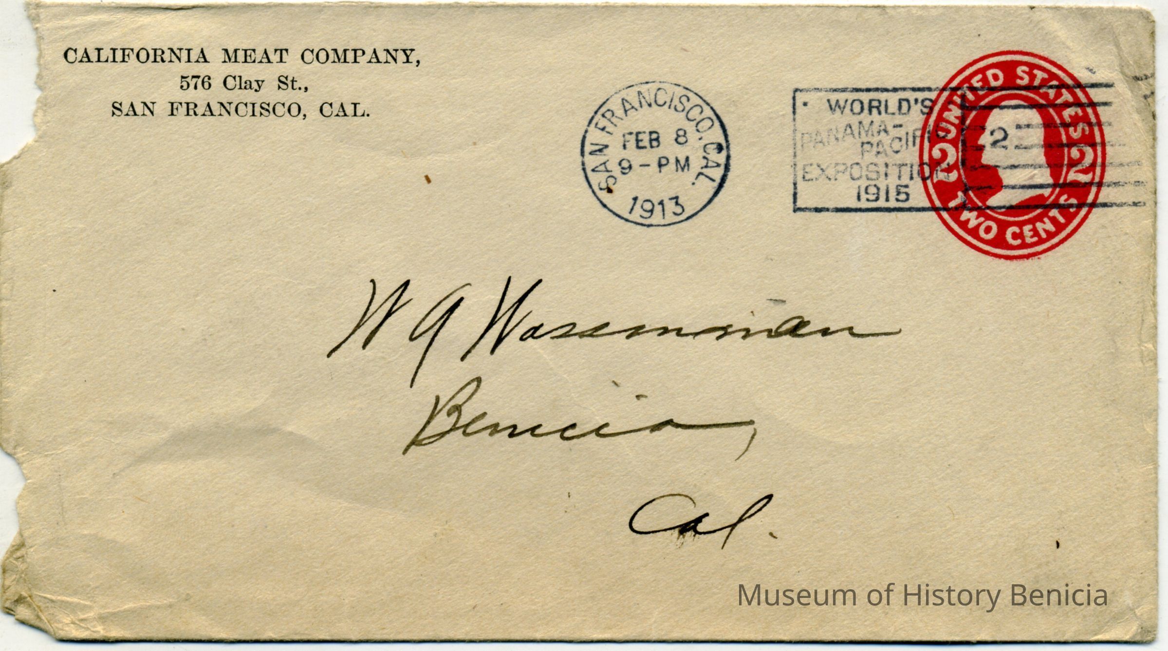 This is an envelope from the California Meat Company in San Francisco to W.G. Wassmann in Benicia. It was mailed 02/08/1913. It has the cancellation stamp for the Panama Pacific Exposition held in 1915 in San Francisco.Collection