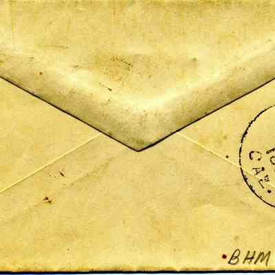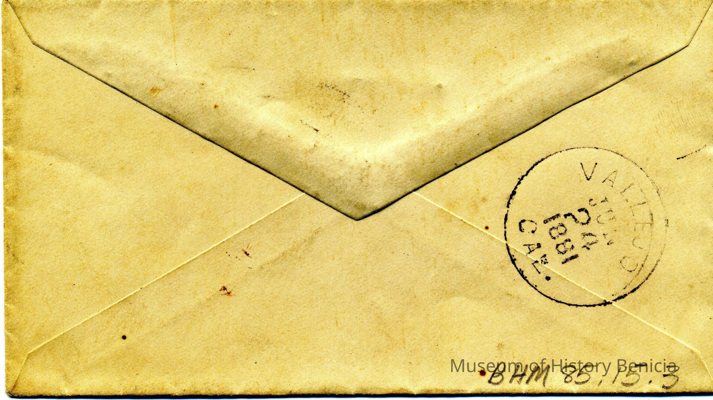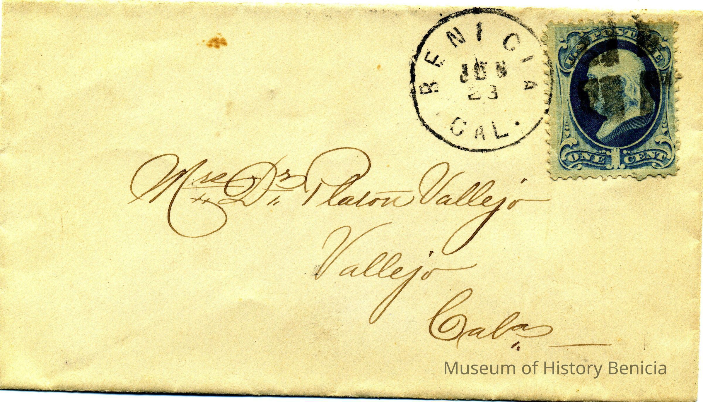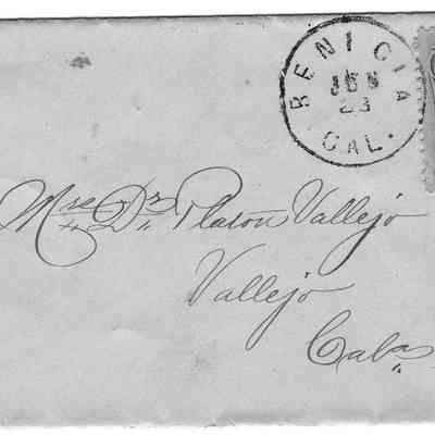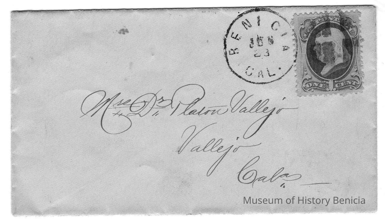 Small white envelope addressed "Mrs Dr. Platon Vallejo in Vallejo,Cal" with blue 1 cent stamp. Cancellation "BENICIA CAL JUN 23" on front; "VALLEJO CAL. JUN 24 1881" on back. No contents.