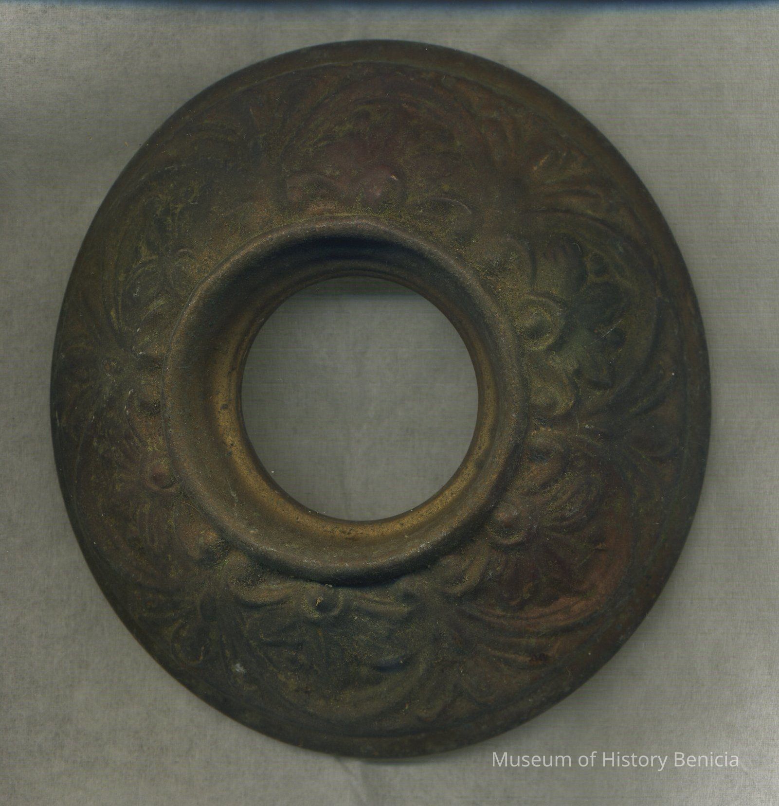 Cap or plate to go around the bottom of an item like a light bulb perhaps; decorative metal;