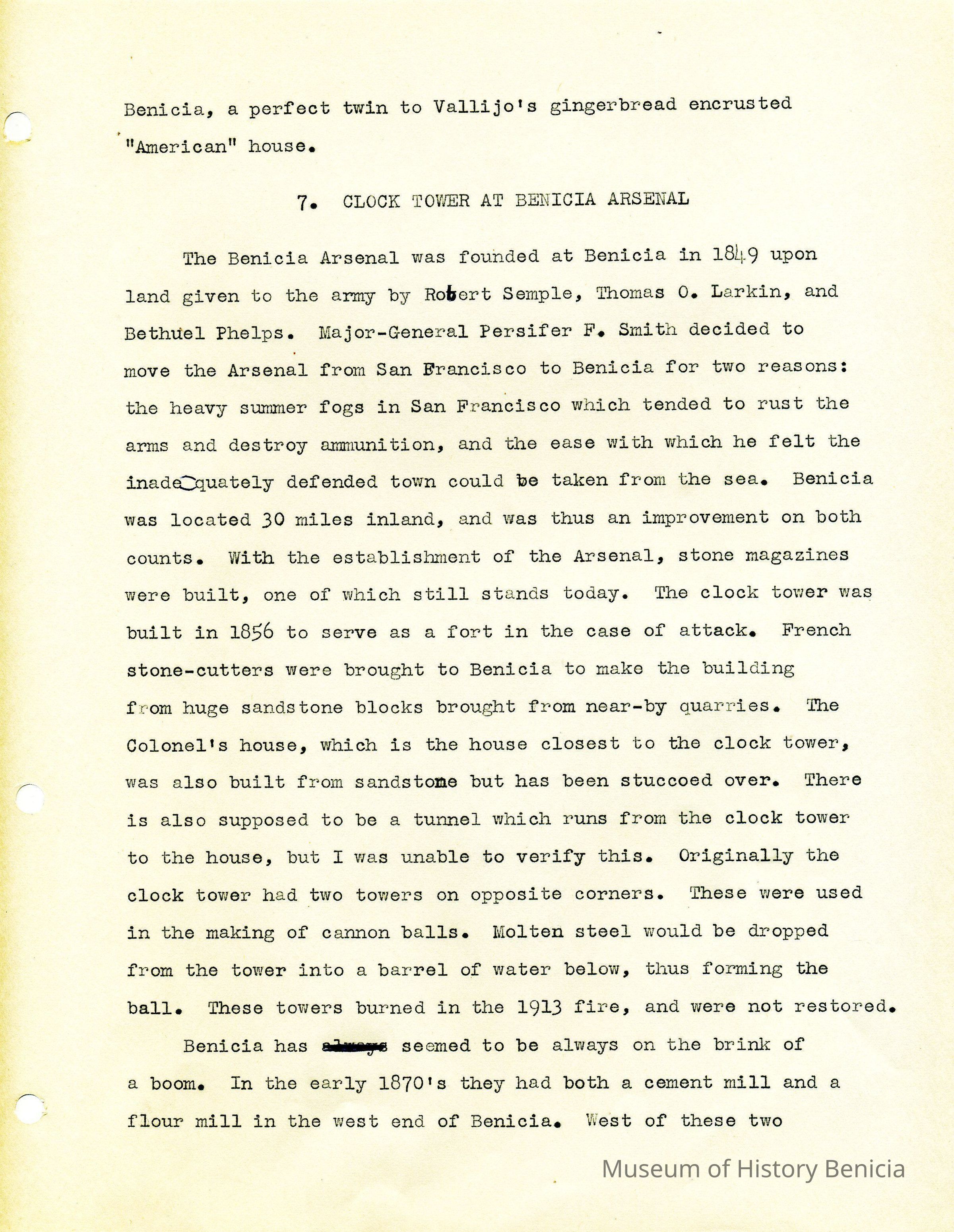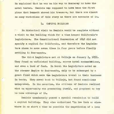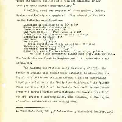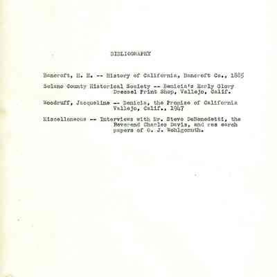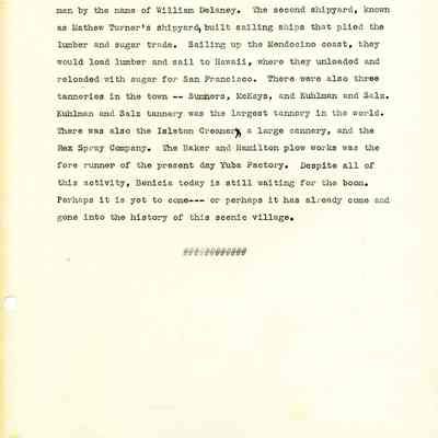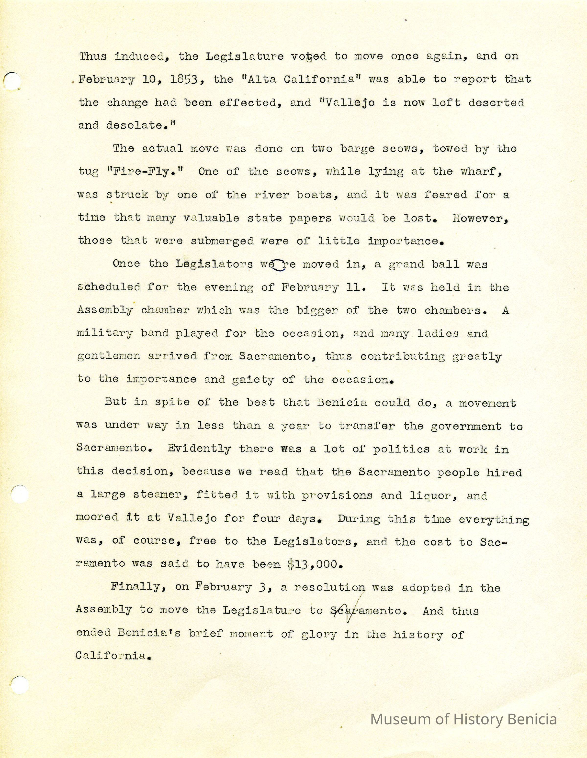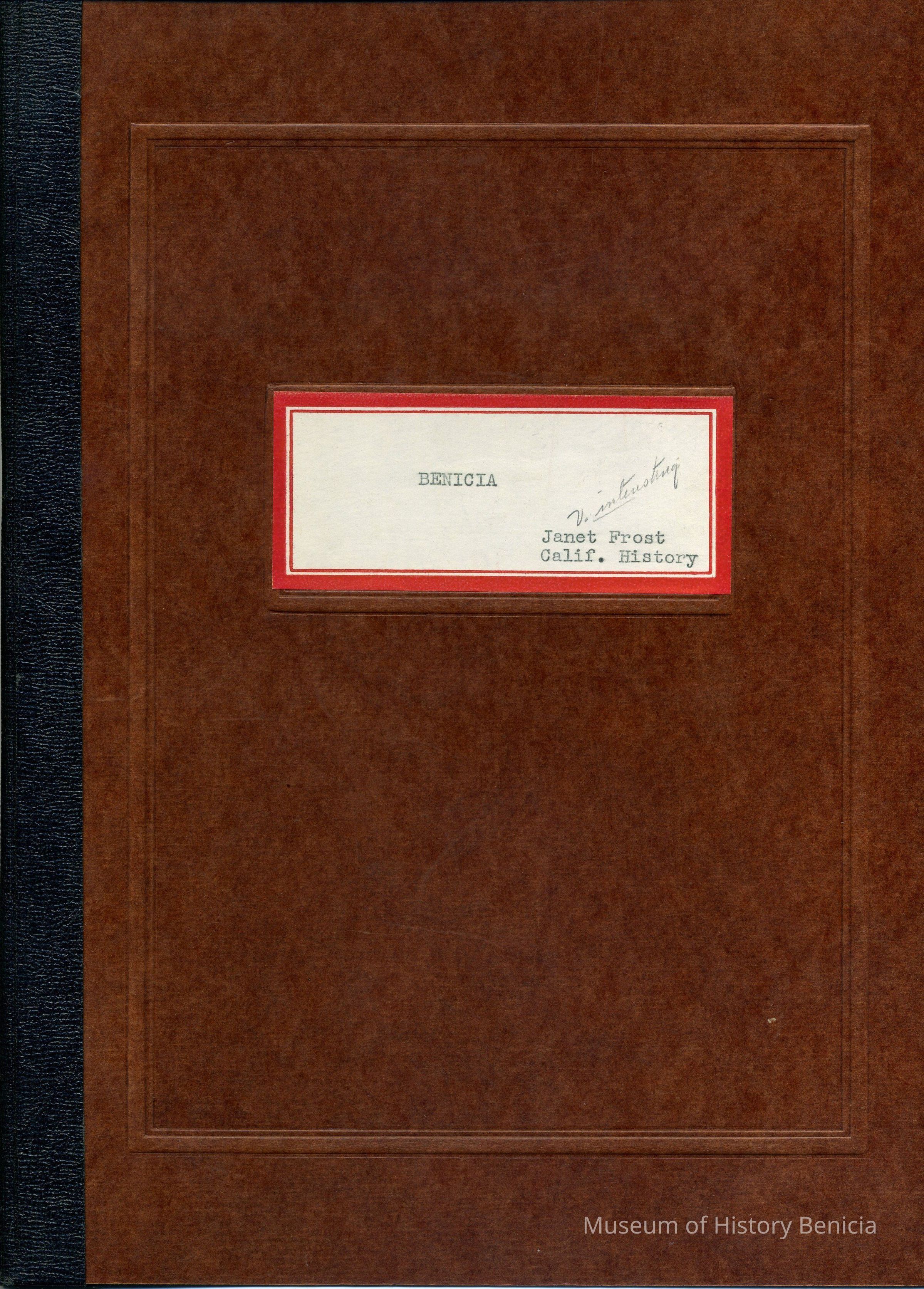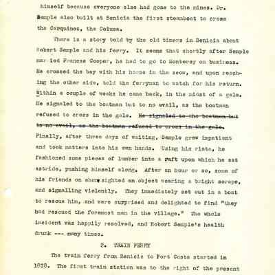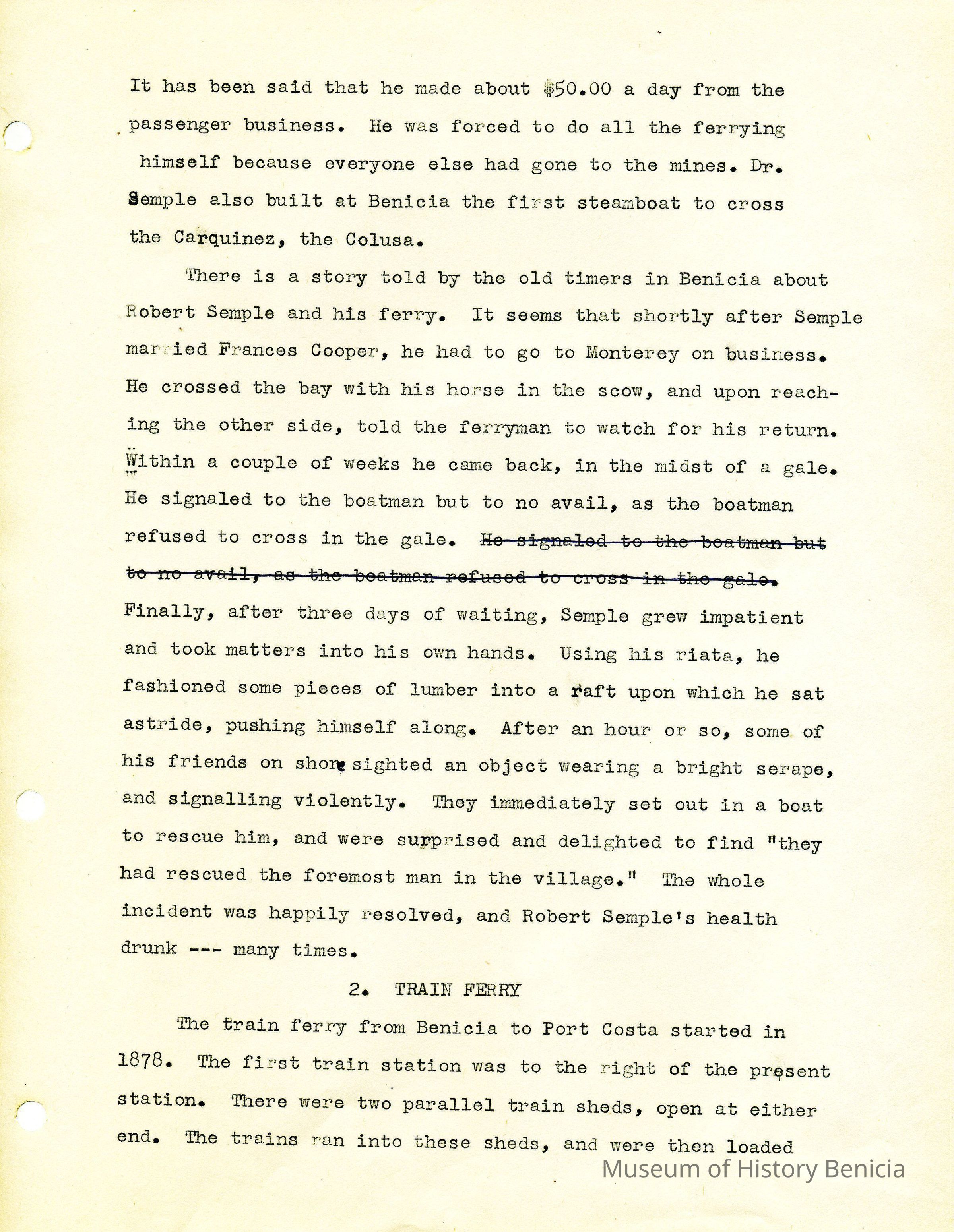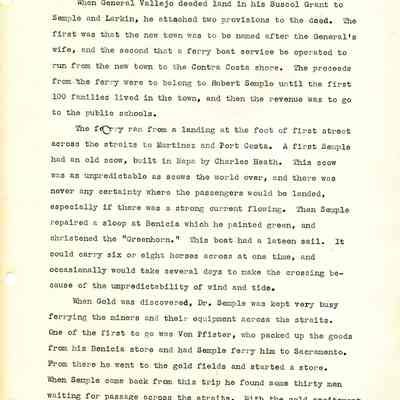 Twelve page essay by Janet Frost on California History and specifically Robert Semple's Ferryboat in Benicia. She starts with General Vallejo deeding land that had two provisions to the deed. The first was that the new town was to be named after the General's wife, and the second that a ferry boat service be operated to run from the new town to the Contra Costa shore. The proceeds from the ferry were to belong to Robert Semple until the first 100 families lived in the town, and then the revenue was to go to the public schools.