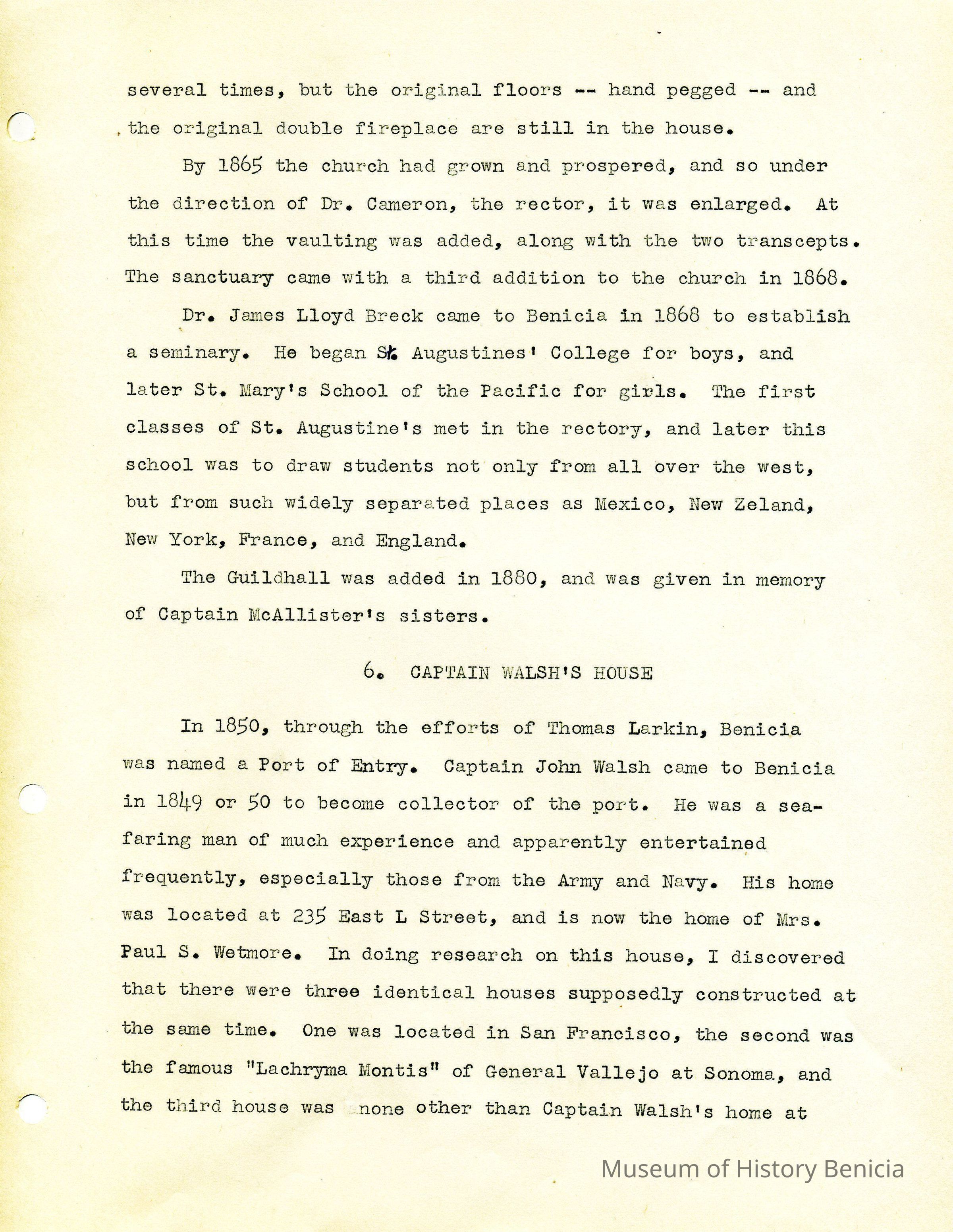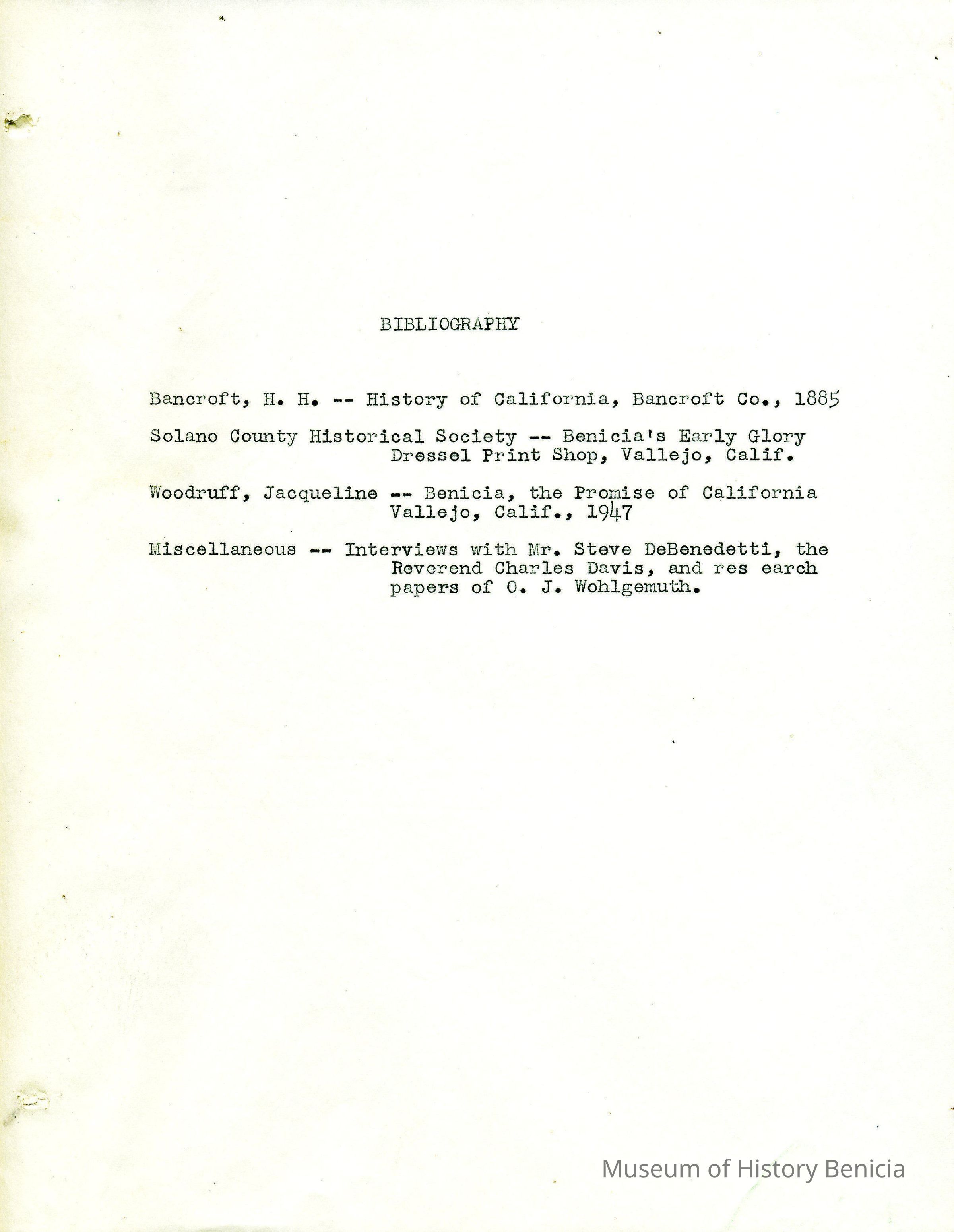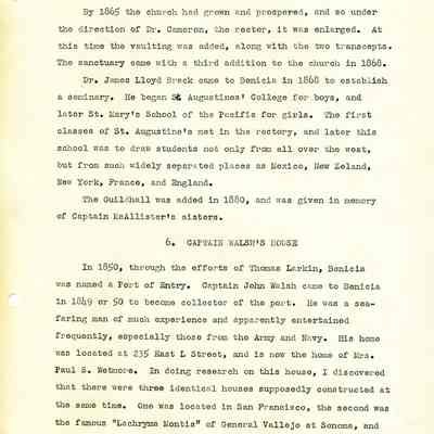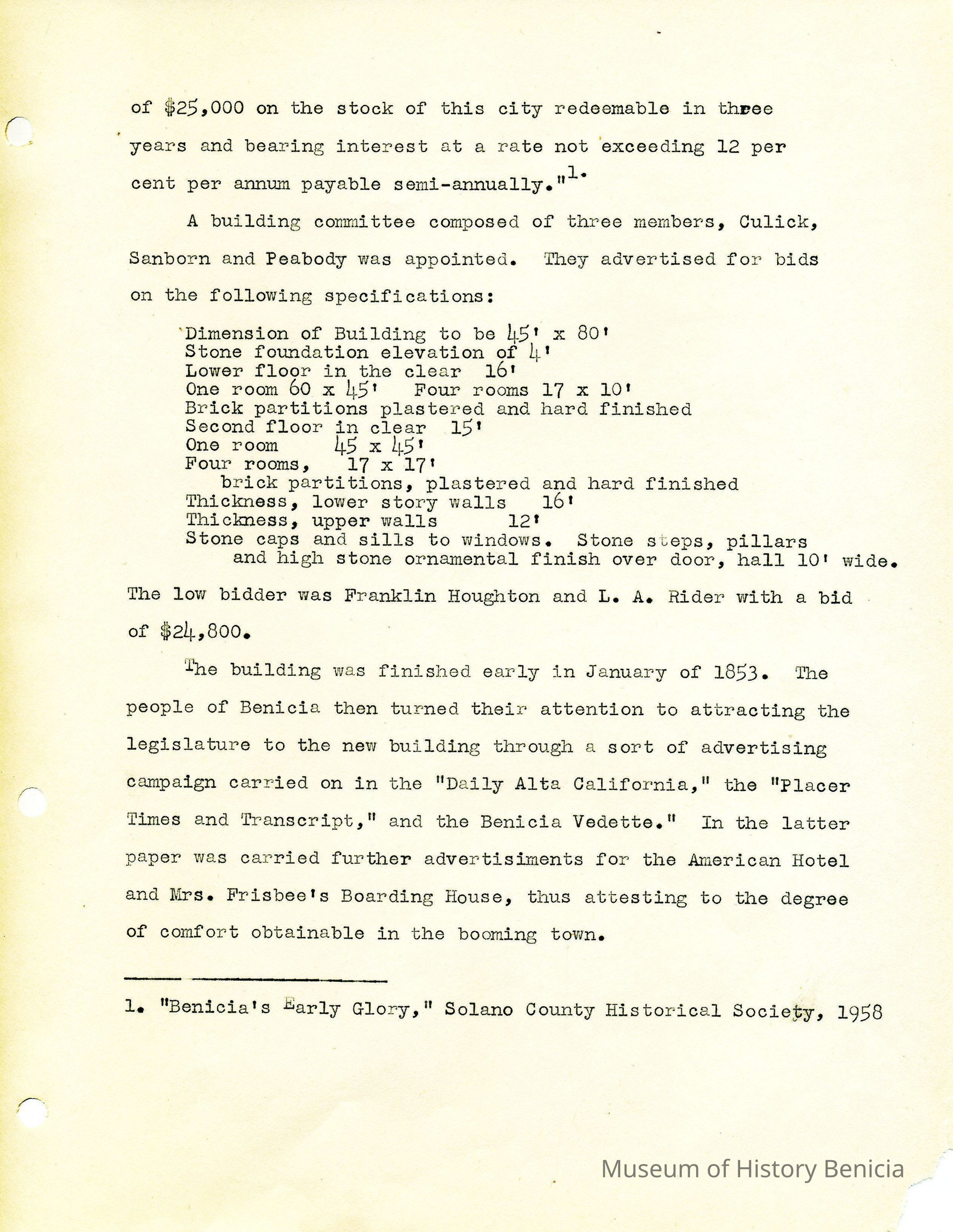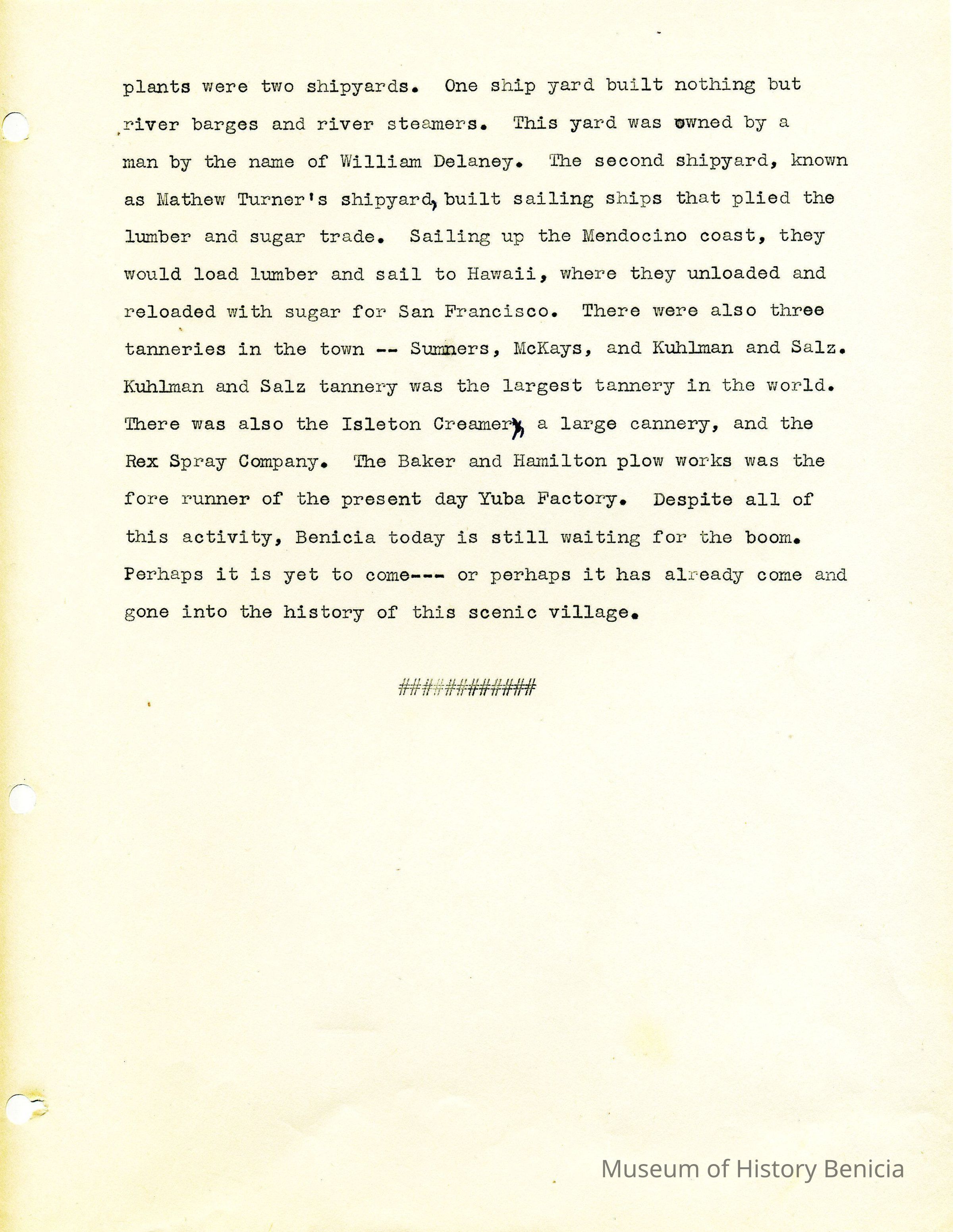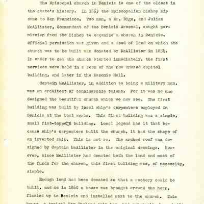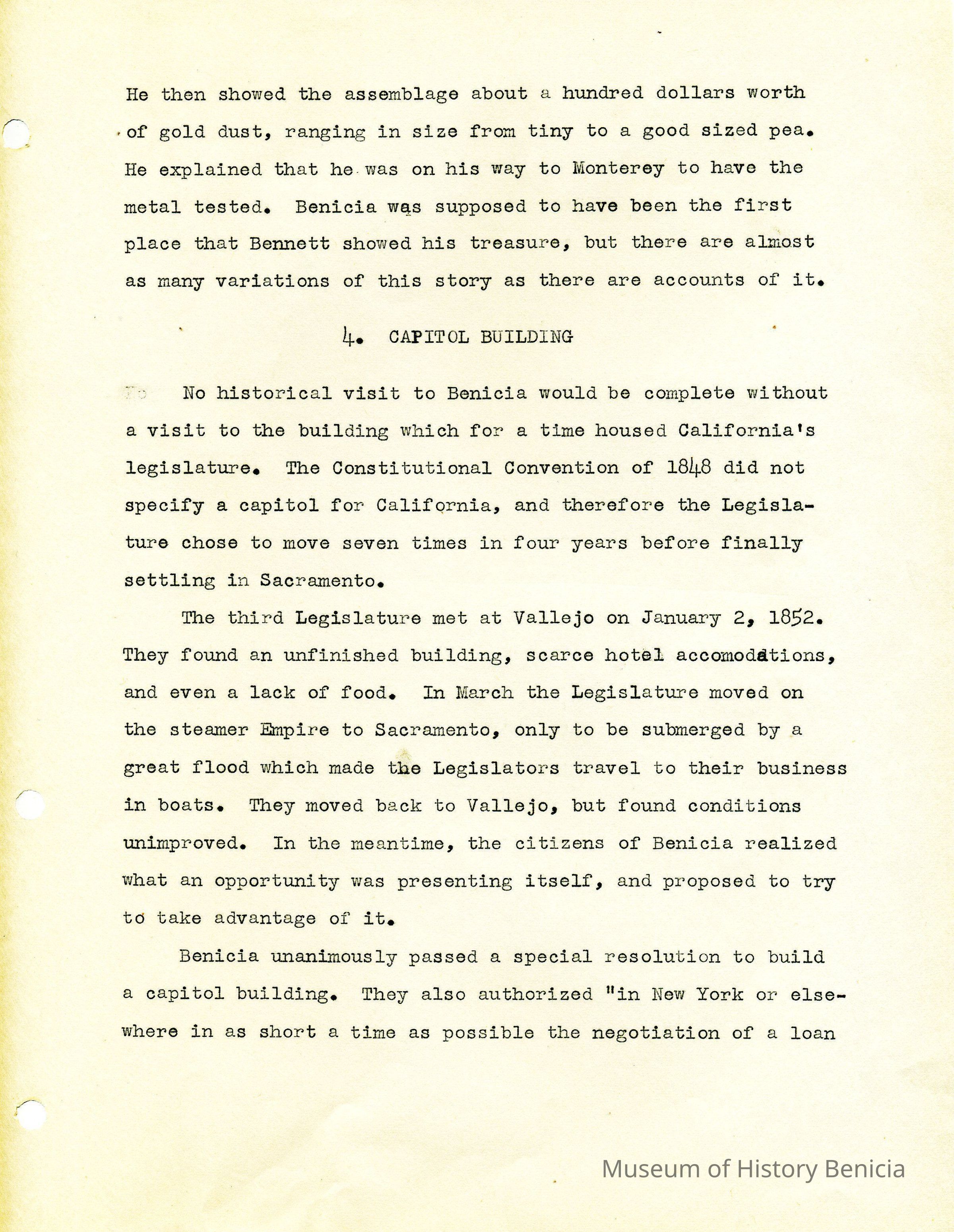 Twelve page essay by Janet Frost on California History and specifically Robert Semple's Ferryboat in Benicia. She starts with General Vallejo deeding land that had two provisions to the deed. The first was that the new town was to be named after the General's wife, and the second that a ferry boat service be operated to run from the new town to the Contra Costa shore. The proceeds from the ferry were to belong to Robert Semple until the first 100 families lived in the town, and then the revenue was to go to the public schools.
