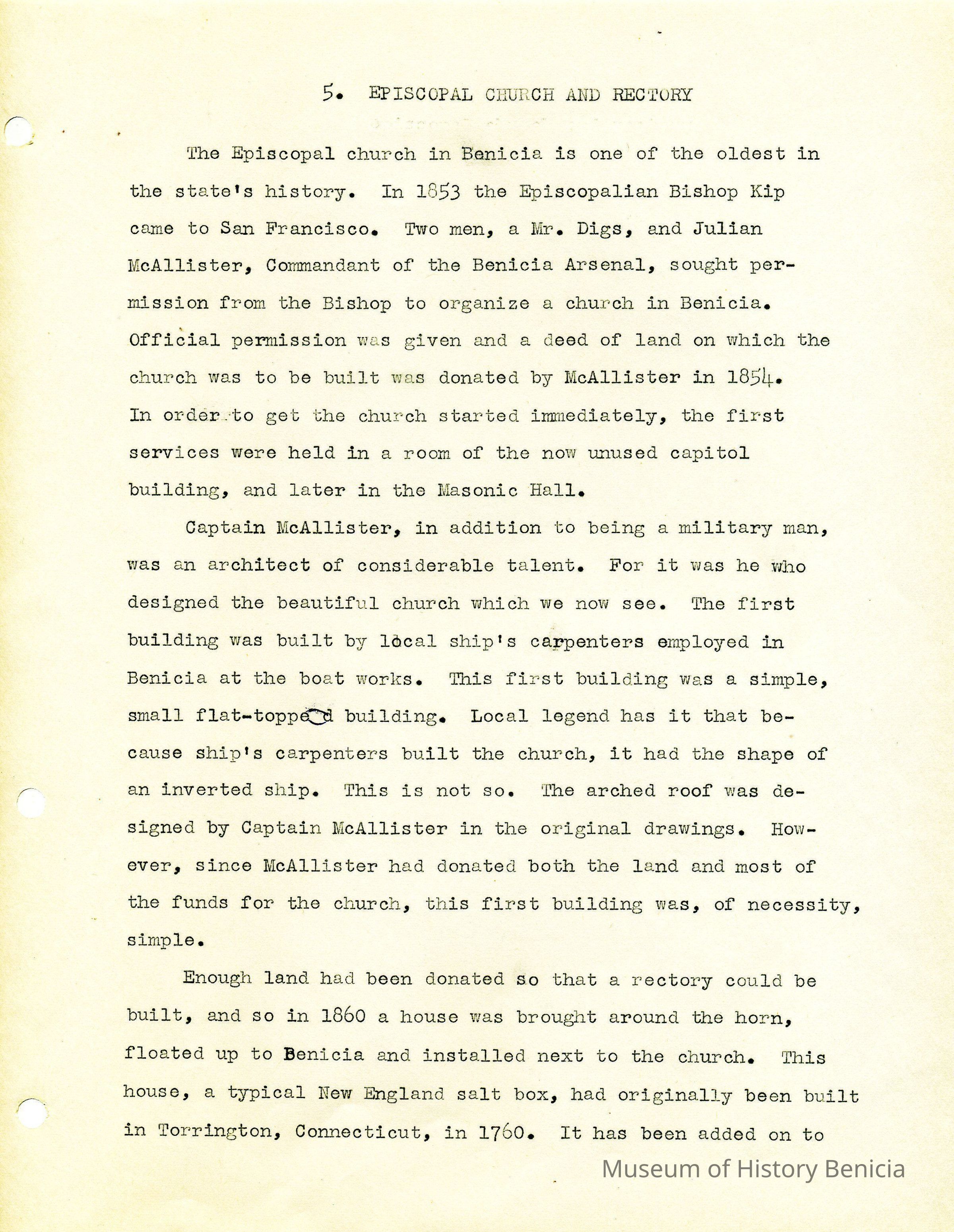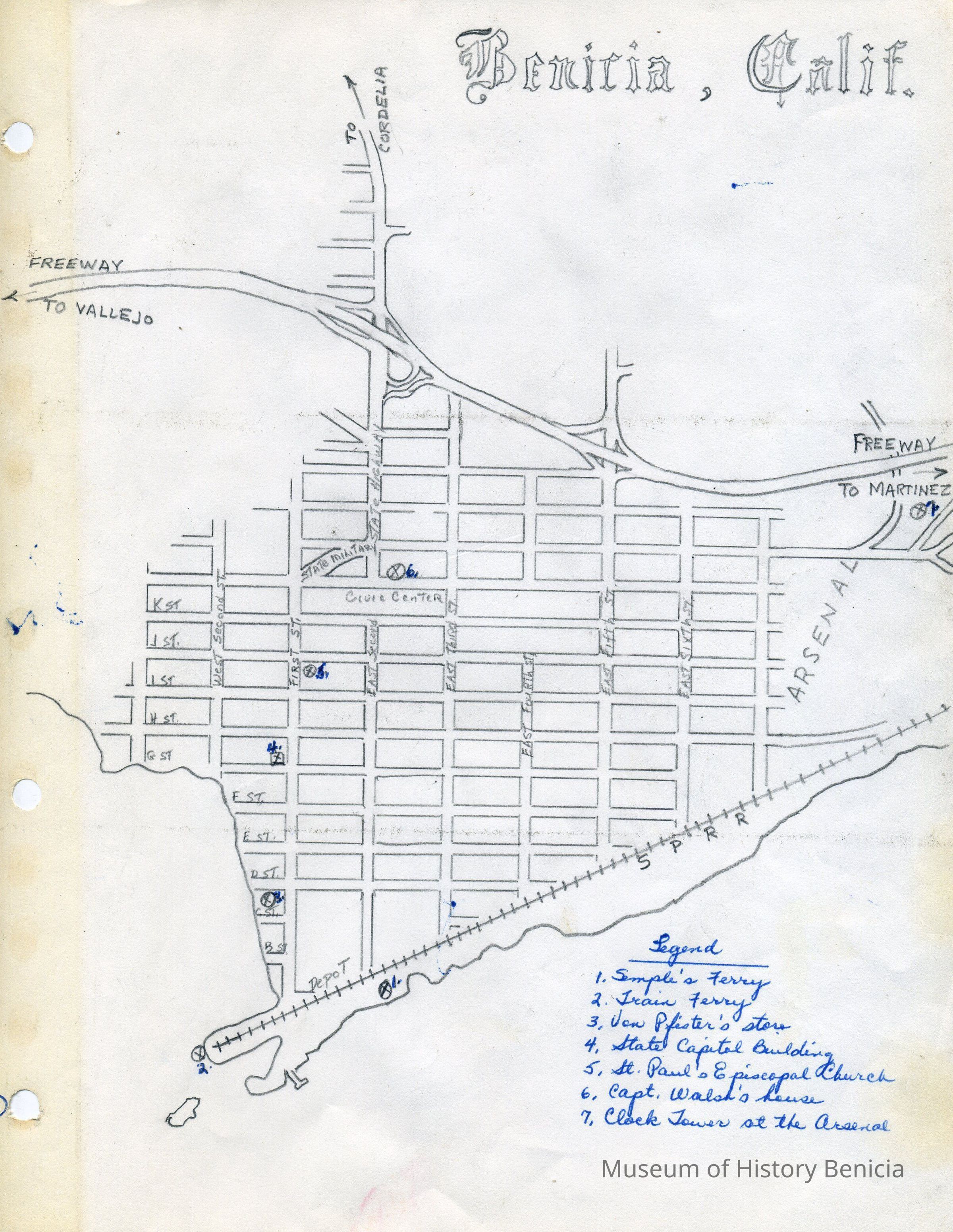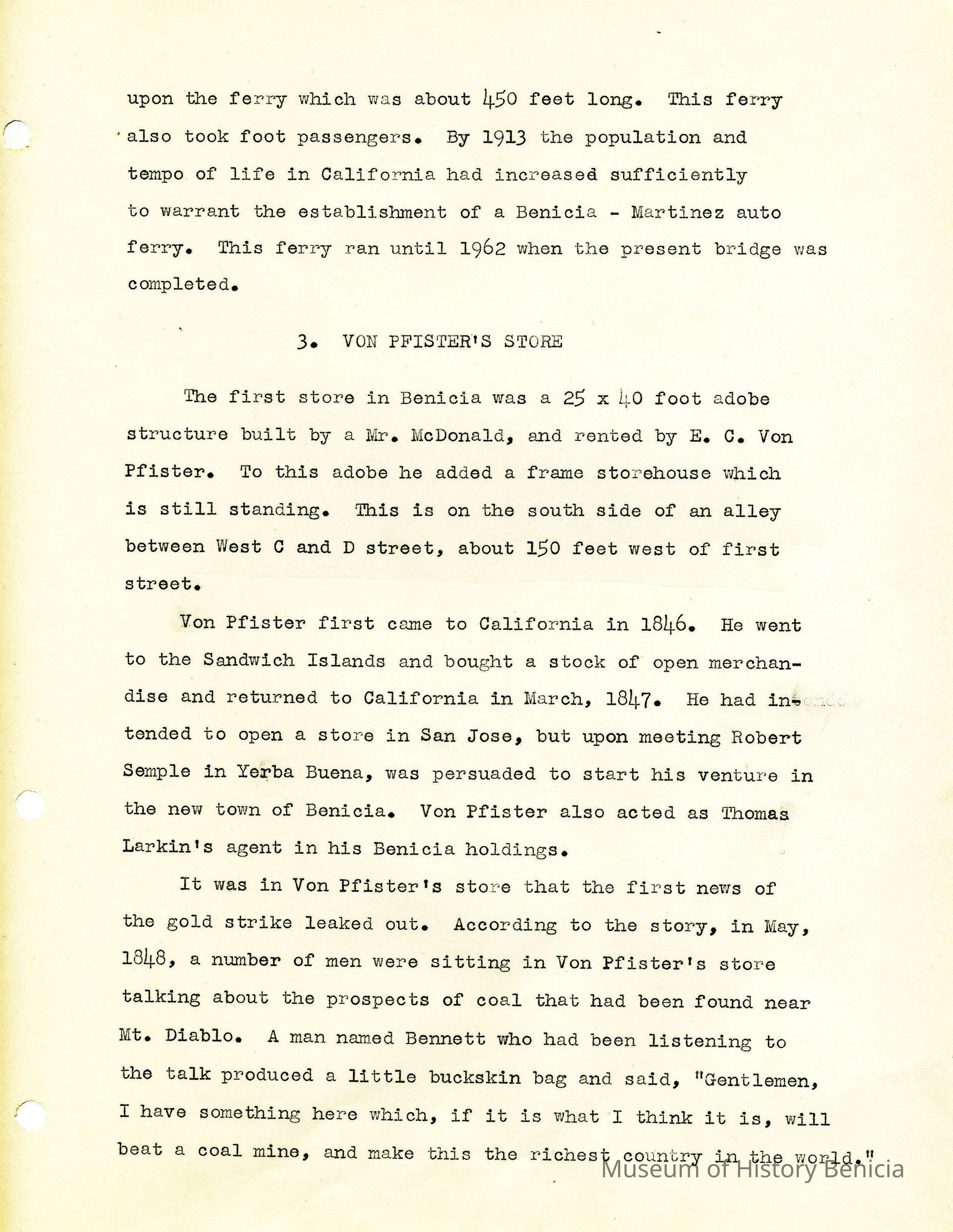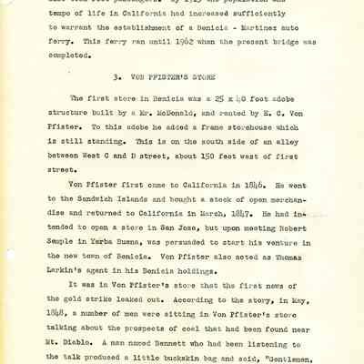 The ferry ran from the foot of First Street to both Martinez and Port Costa. She goes on to touch upon several significant items from the early Benicia history.