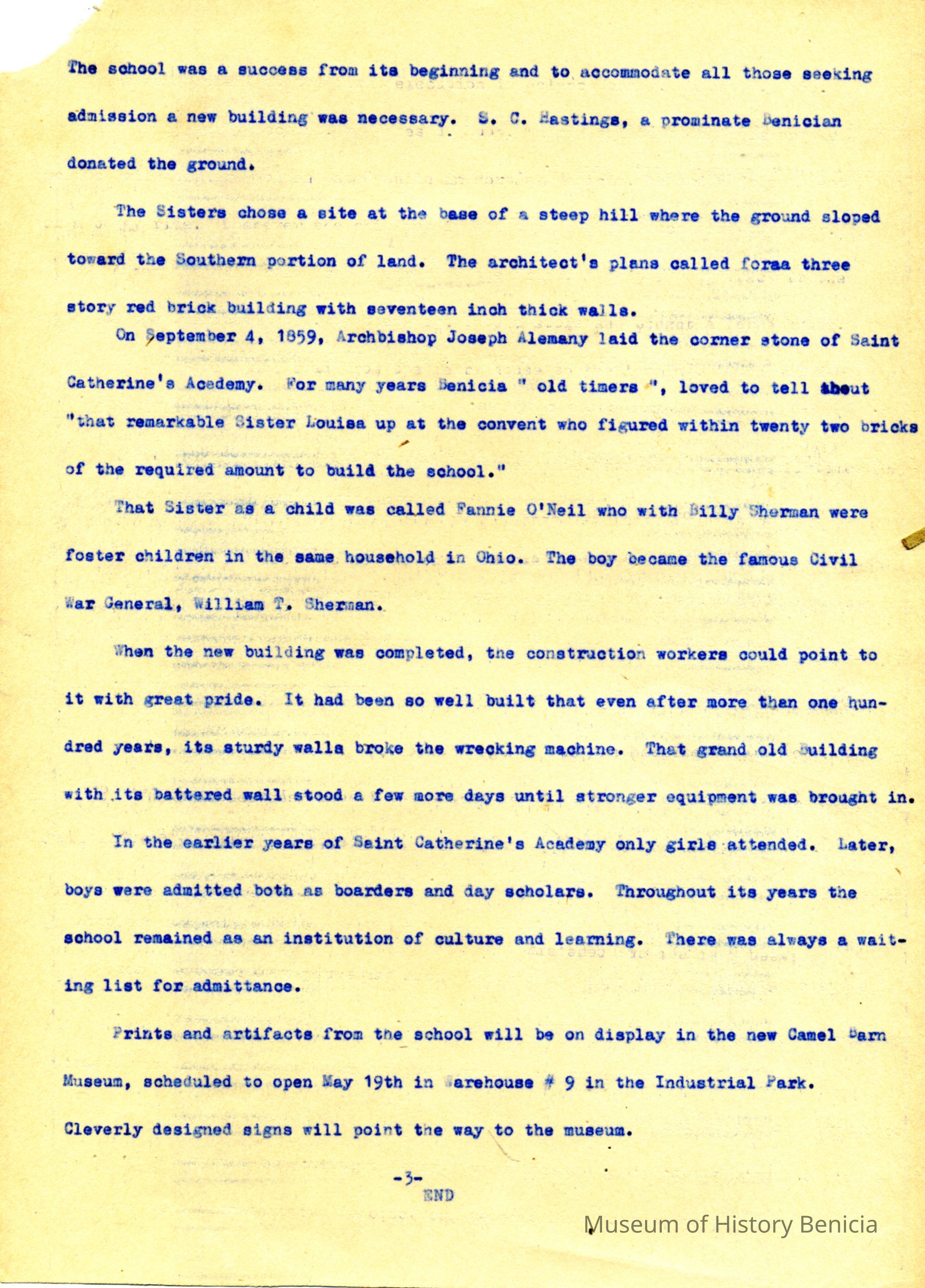 This is a mimeographed sheet talking about the start of St. Catherine's Academy in Benicia. This is page 3 and the first two pages are missing. The text was explaining facts about the academy in preparation of the opening of the Camel Barn Museum in 1985.