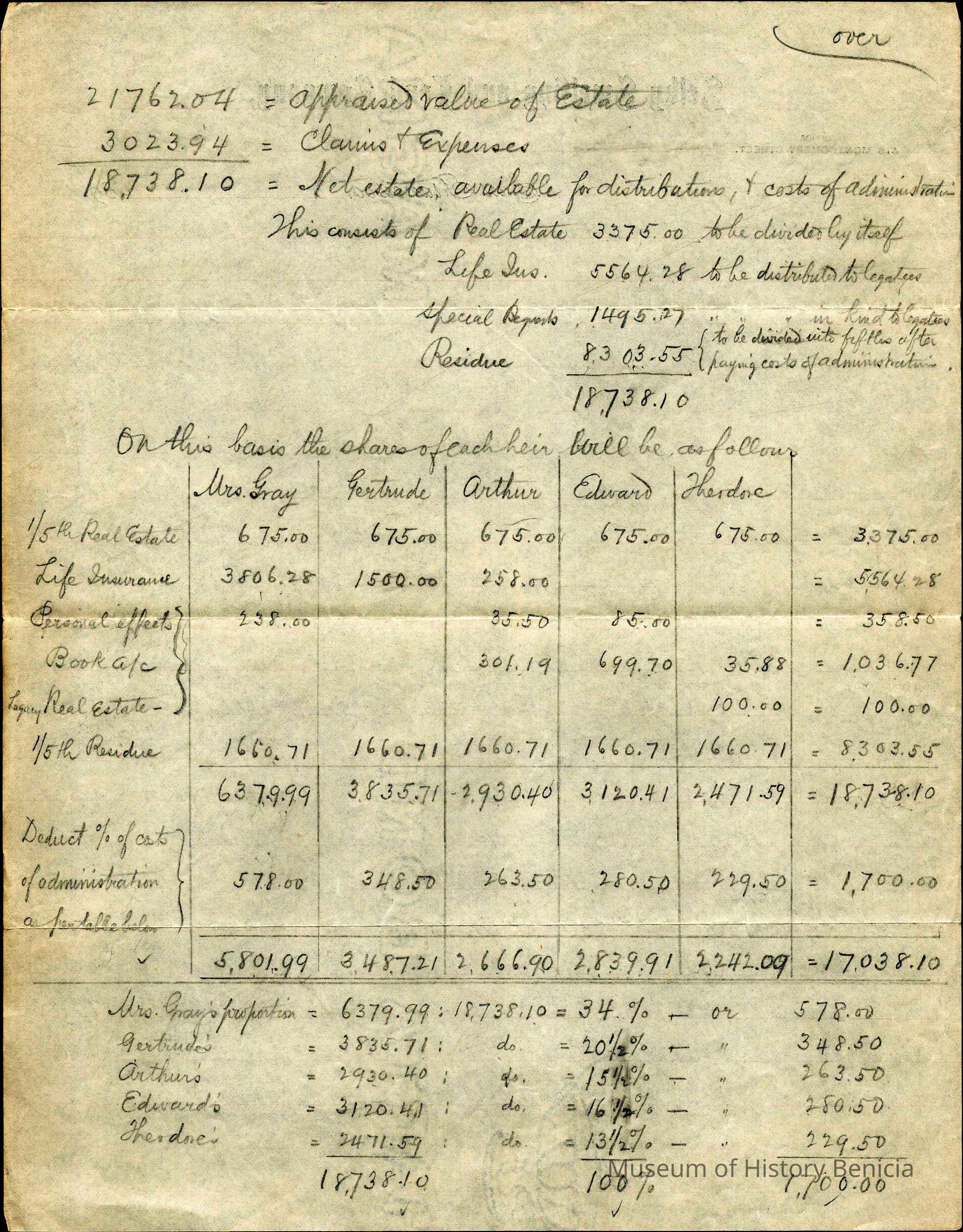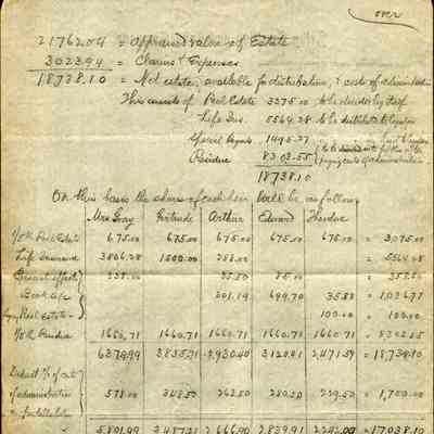 The document is an asset distribution draft dated March 14, 1893, for the estate of Samuel C. Gray. It is presented on the letterhead of the Selby Smelting and Lead Company, located at 416 Montgomery Street in San Francisco. This draft outlines the financial allocations among various individuals, Mr. Gray's heirs or beneficiaries, identified as Mrs. Gray, Gertrude, Arthur, Edward, and Theodore. The distribution categorizes assets such as Real Estate, Other (possibly miscellaneous items), Furniture, Personal Effects, D____(?) Assets, and Life Insurance. Each beneficiary receives varying amounts, with the overall total meticulously calculated. Additionally, there is a note suggesting a potential equal sharing of administrative costs, pending a court decision. The totals for each category are clearly itemized in columns, and further calculations appear in a summarized form at the bottom, including an indication of the overall estate value, which is a sum of several financial distributions spread across different categories with total amounts written at the bottom.