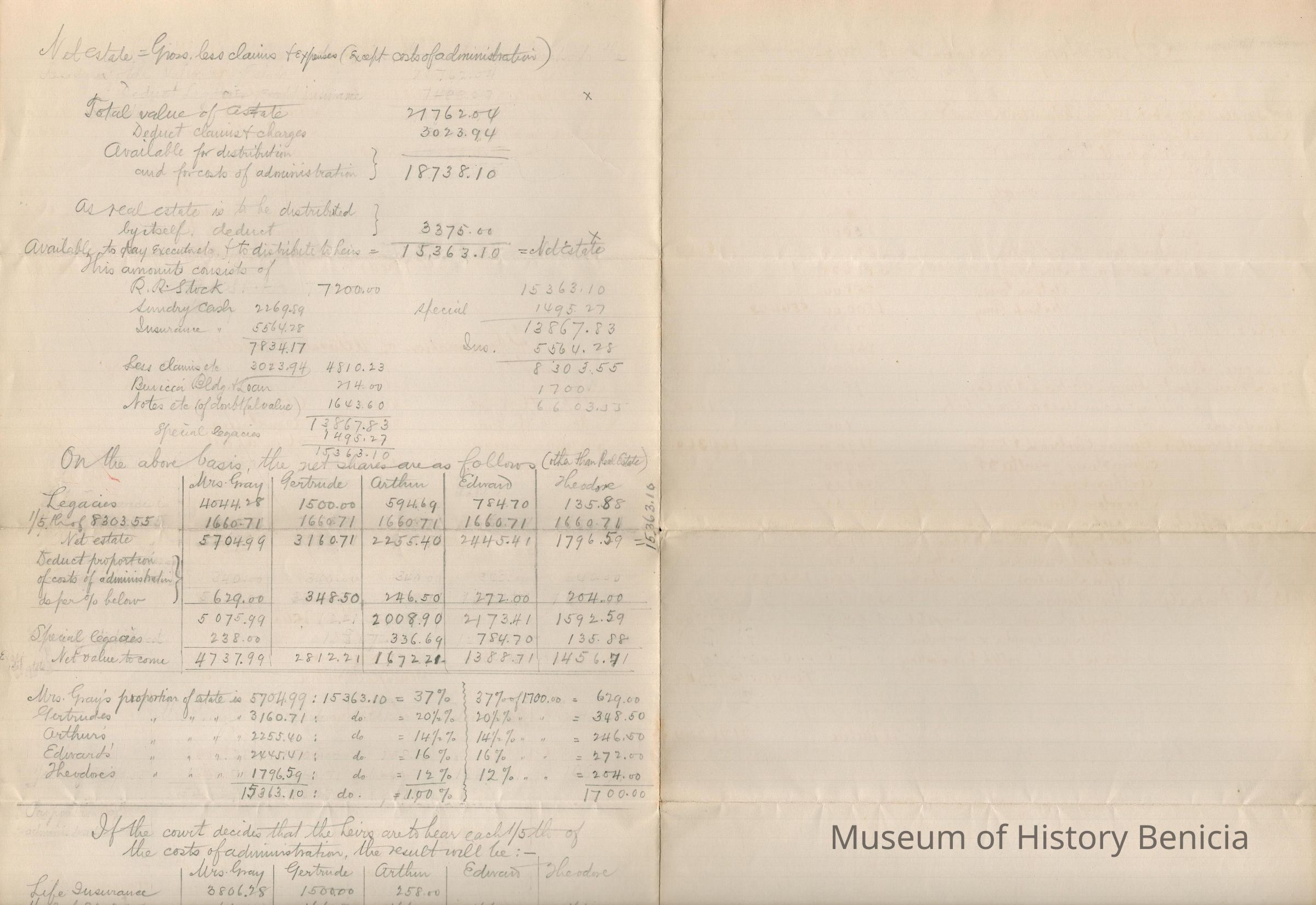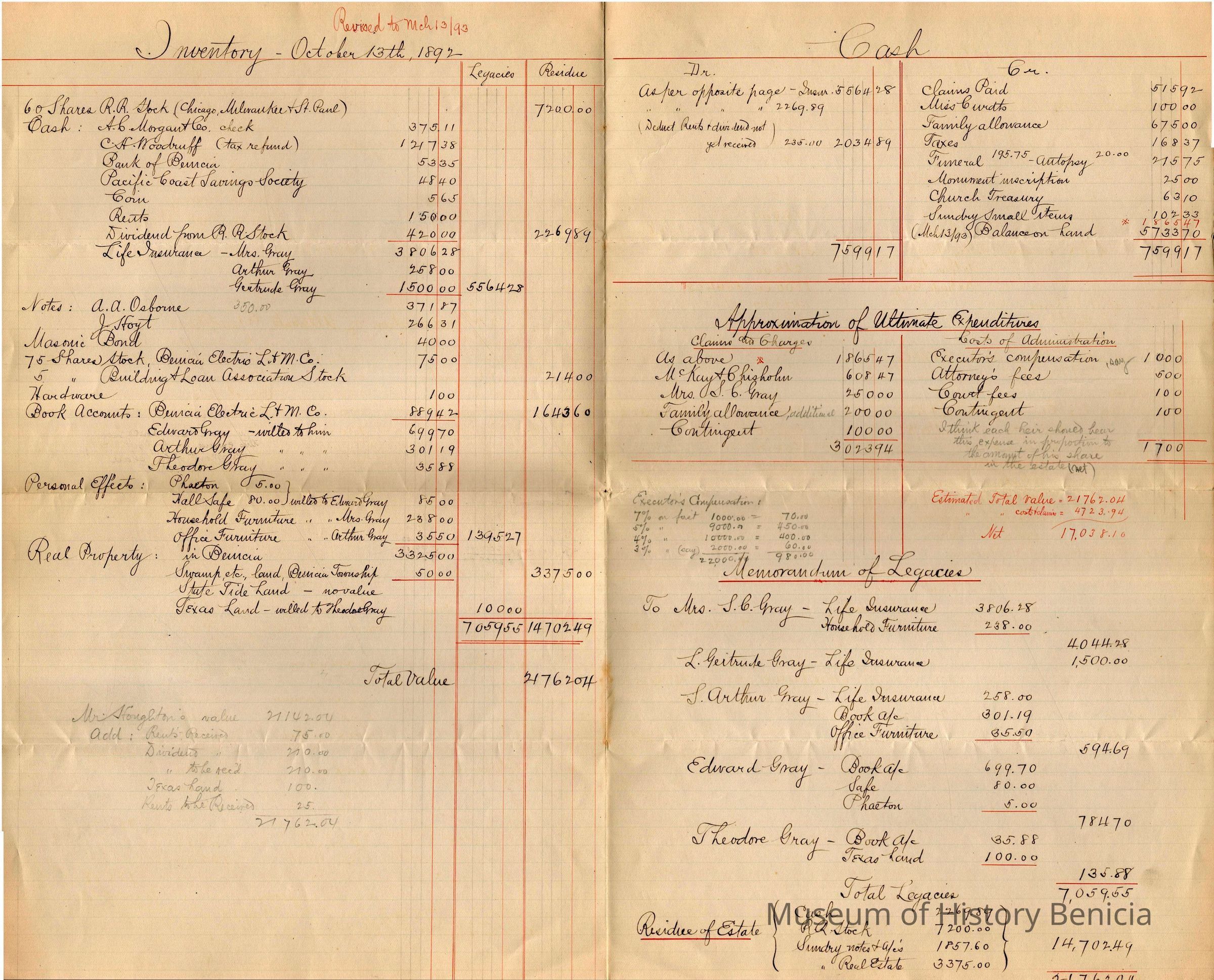 This is an inventory sheet of the Samuel C Gray's estate. It was created 10/13/1892 and updated to 03/13/1893. It was probably created by C.B. Houghton, executor. The back of this sheet shows the Net Balance of the estate and a couple of estimates of how the monies will be divided depending on the court's decisions.
