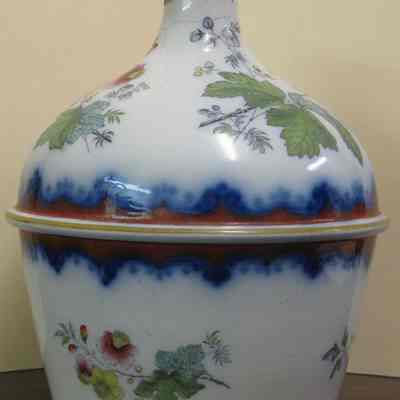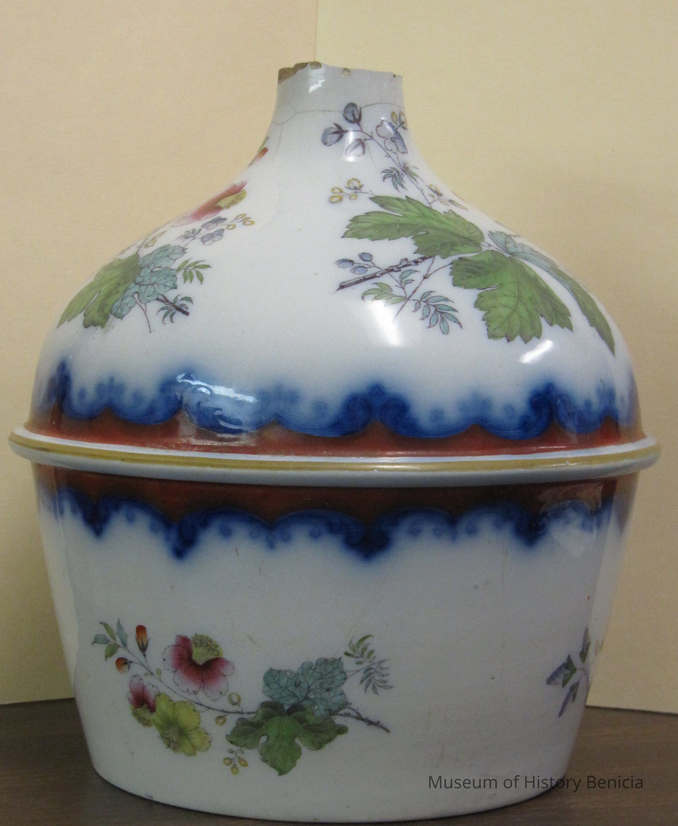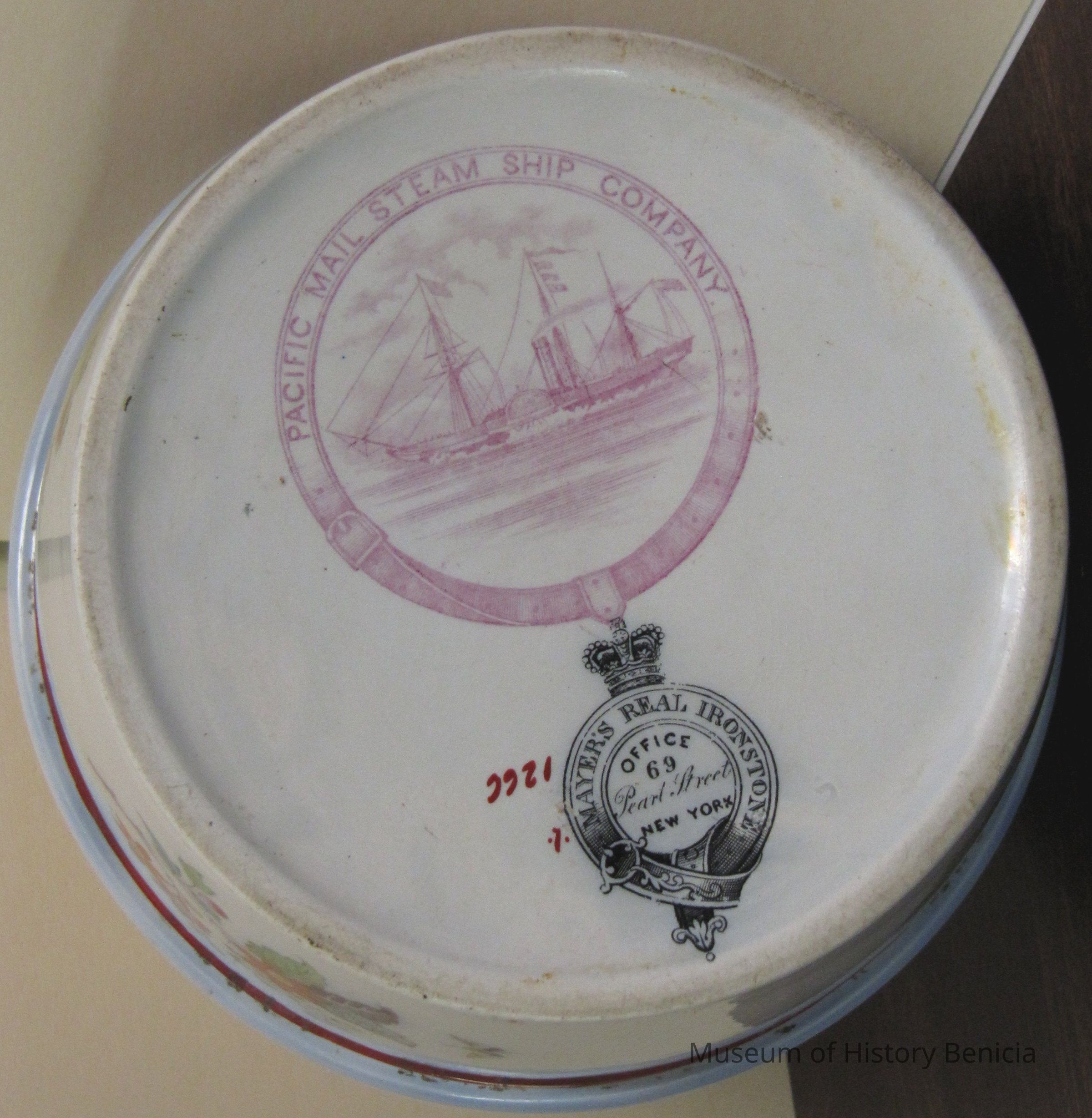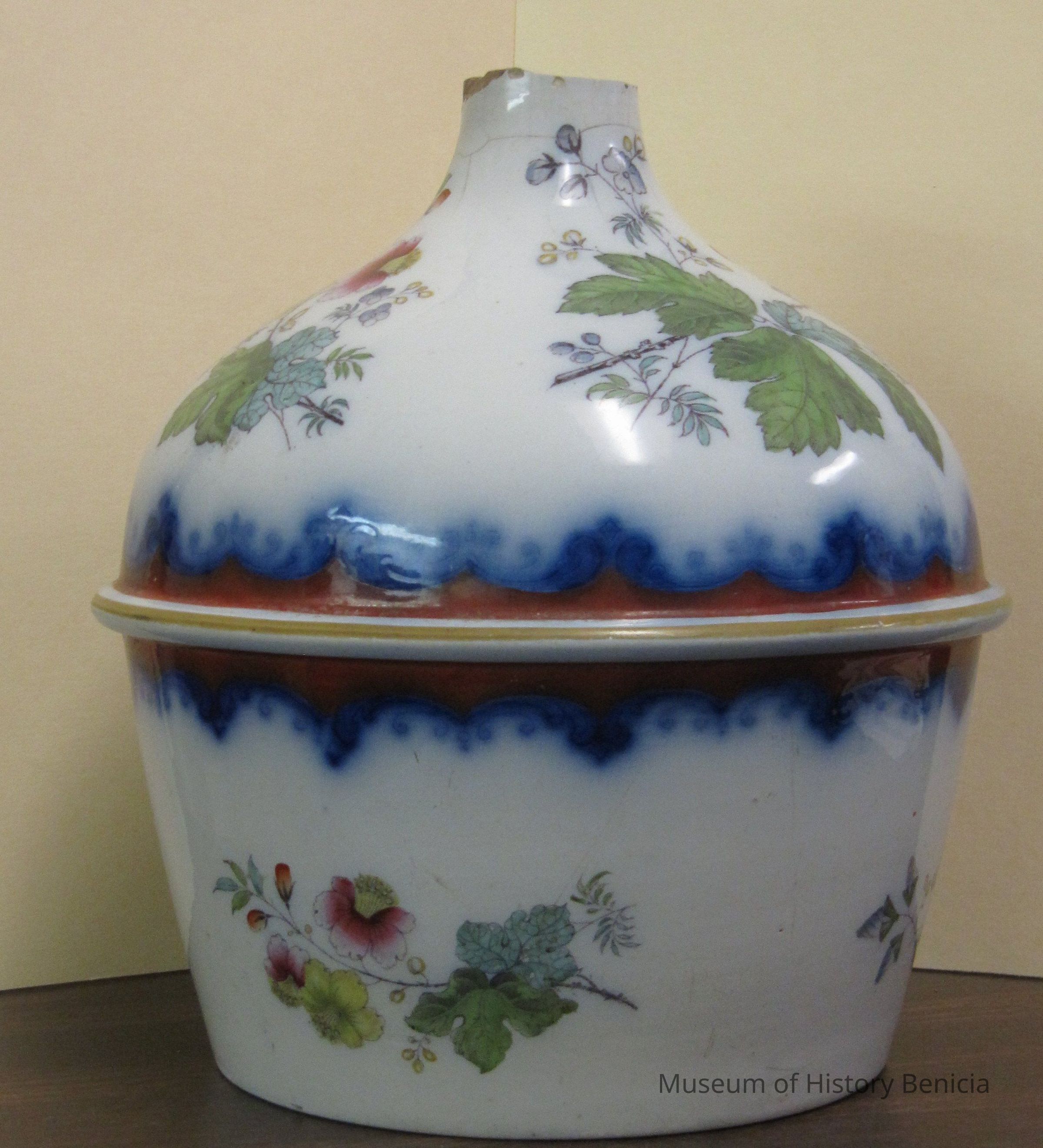 Water ewer made of porcelain with hand painted flowers around it. Marked PMSS Co. on bottom. Manufactured by the Mayer's Real Ironstone, New York # 1266. The top is broken and a few crazed cracks can be seen around the top. It was dug from the mud flats of Benicia circa 1880. It is predominantly blur and rust color.