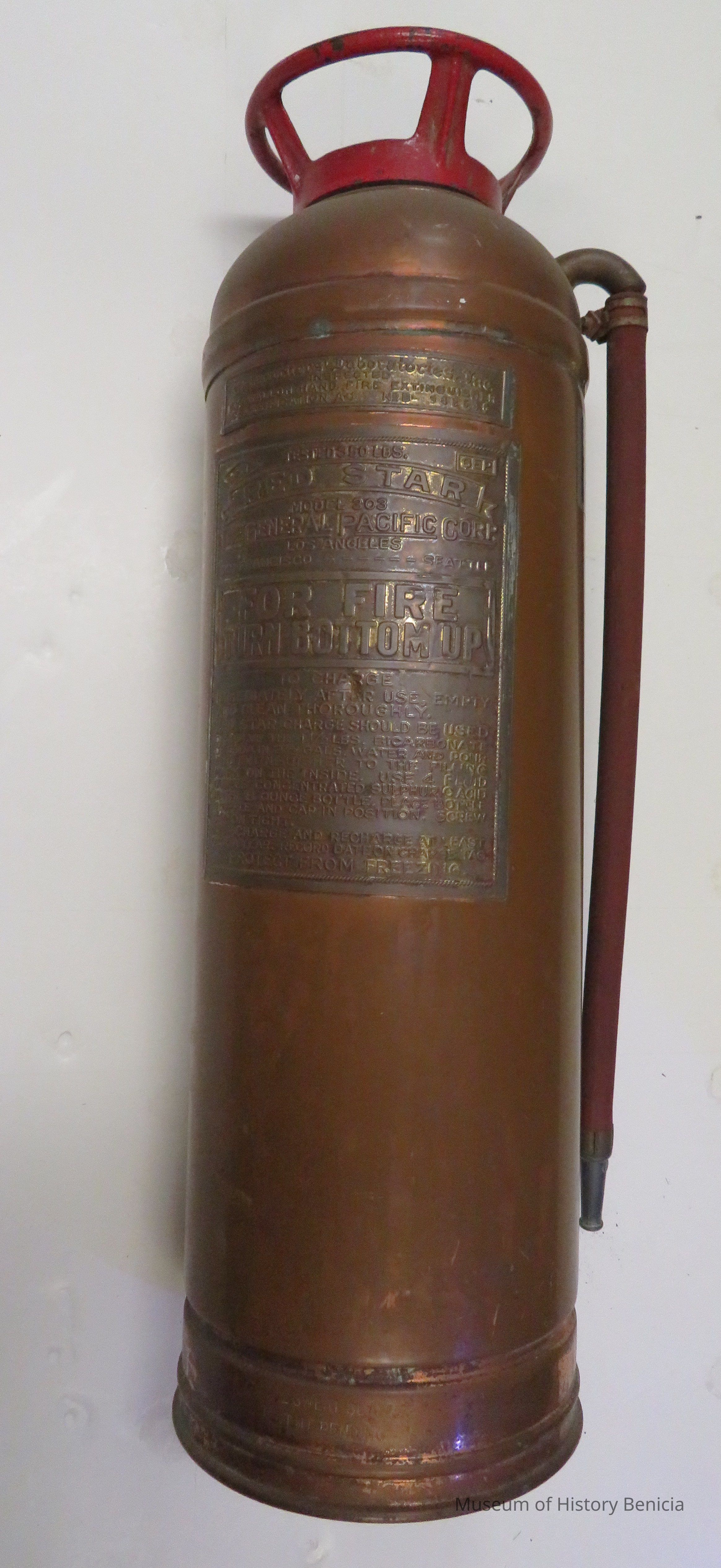 Tested 350 lbs. Inscribed with "Red Star Model 303 - The General Pacific Corp." Instructions are listed. Another metal attachment reads "Hydorstatically tested by Vallejo Fire Extinguisher Service, 1973-75.Collection