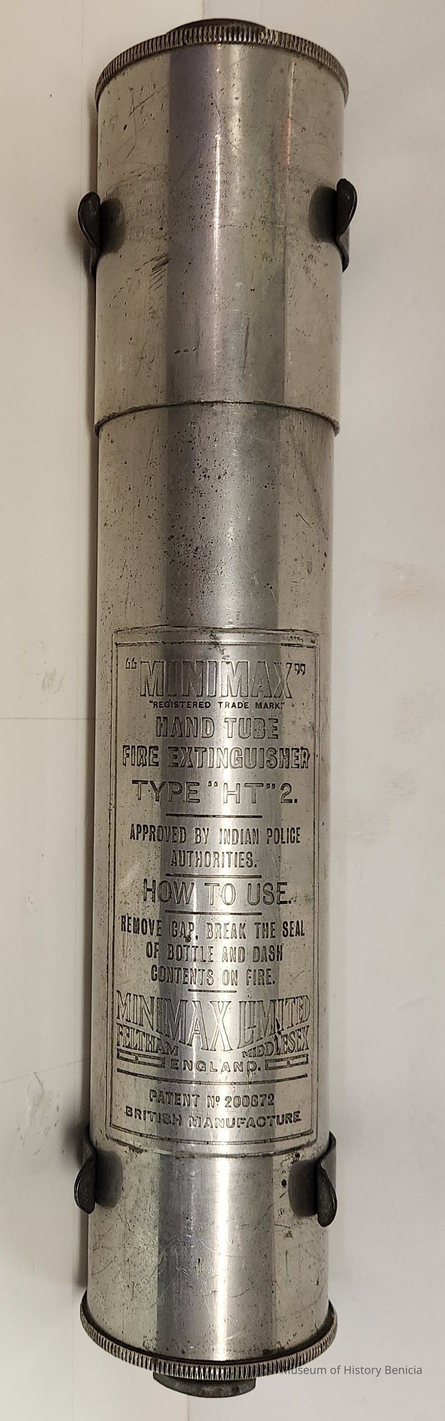 cylindrical tube fire extinguisher; steal with cap on end; includes metal bracket with clips to attach to a wall; British Manufacture;