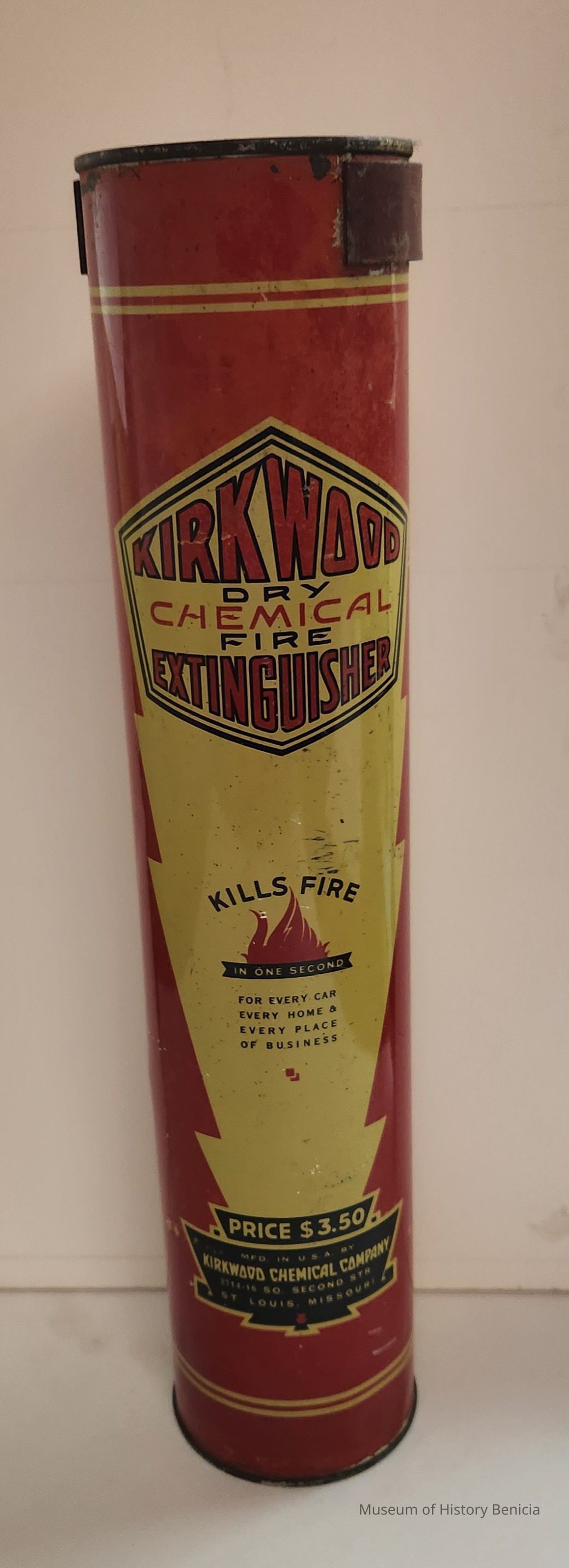 label: Kirkwood Dry Chemcal Fire Extinguisher / Kills Fire in One Second / For every car, every home,& every place of business / Price $3.50 / Made in U.S.A. by Kirkwood Chemical Company - 2714 So Second Str St. Louis, MissouriCollection