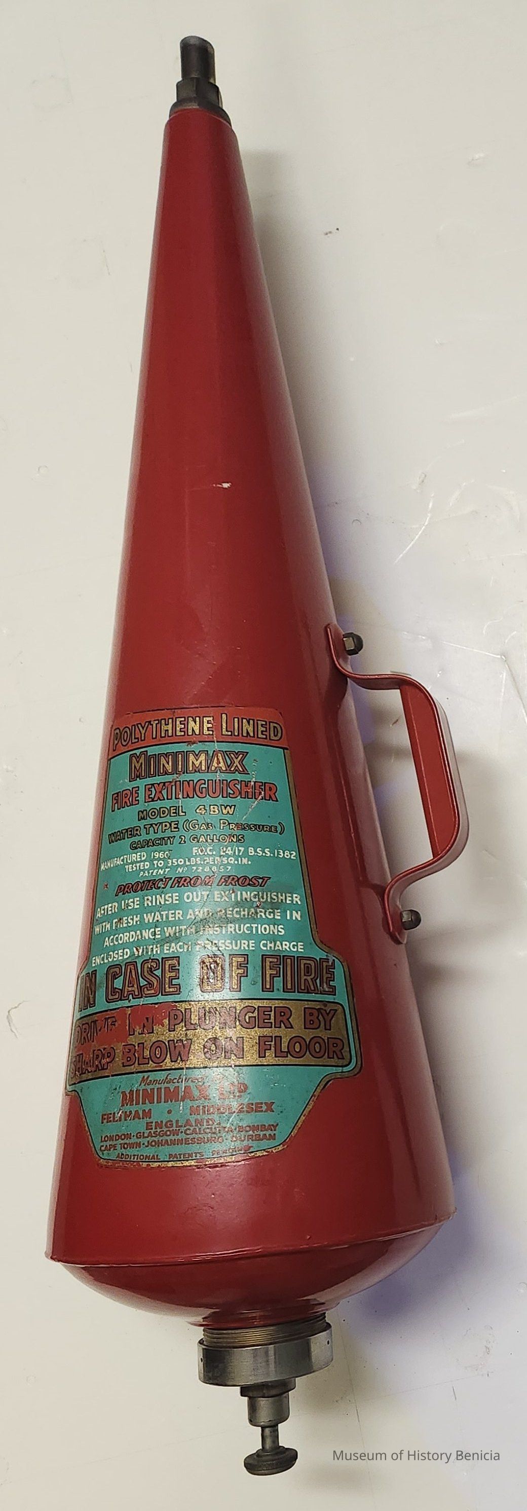 decal label: Polythene lined / Minimax / Fire Extinuisher / Model 4 BW Water Type (Gas Pressure) / Ca[acity 2 gallons / Manufactured 1960 F.O.C. 24/17 B.S.S. 1382 / tested to 350 lbs. per sq. in. / Protect From Frost / [instructions on recharging] / IN CASE OF FIRE / drive in plunger by sharp blow on floor / manufactured by Minimax Ltd. / Feltham - Middlesex / England / additional patents pendingCollection