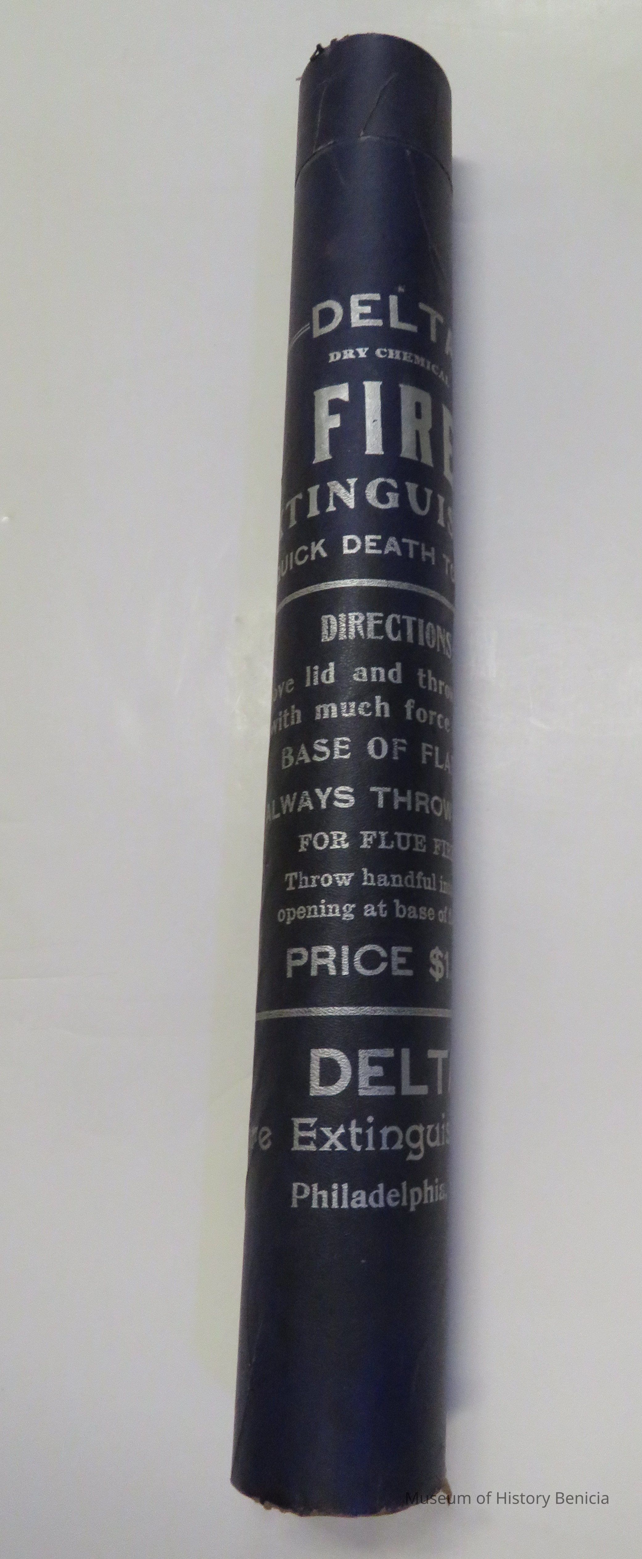 Blue cardboard extinguisher, Delta Dry Chemical Fire Extinguisher. "Quick death to fire." Price $1.50 Made in Philadelphia, PA. by Delta Extinguisher Co. For flue fires.Collection