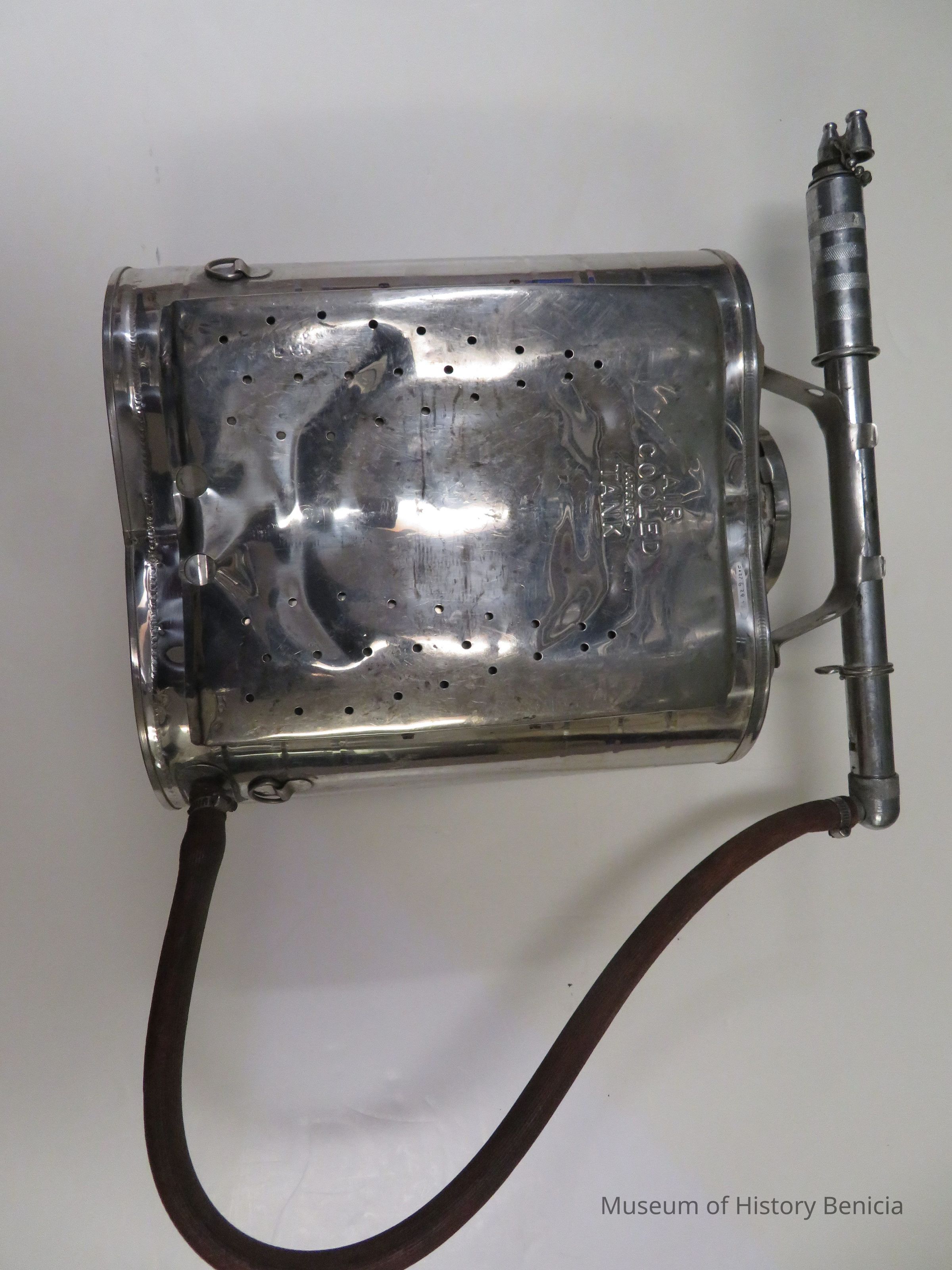 Silver metal fire extinguisher. On front is printed "Air cooled patented tank". On the bottom is printed D. B. Smith and Company with "INDIAN" in the middle and Utica, New York, USA below it.Collection