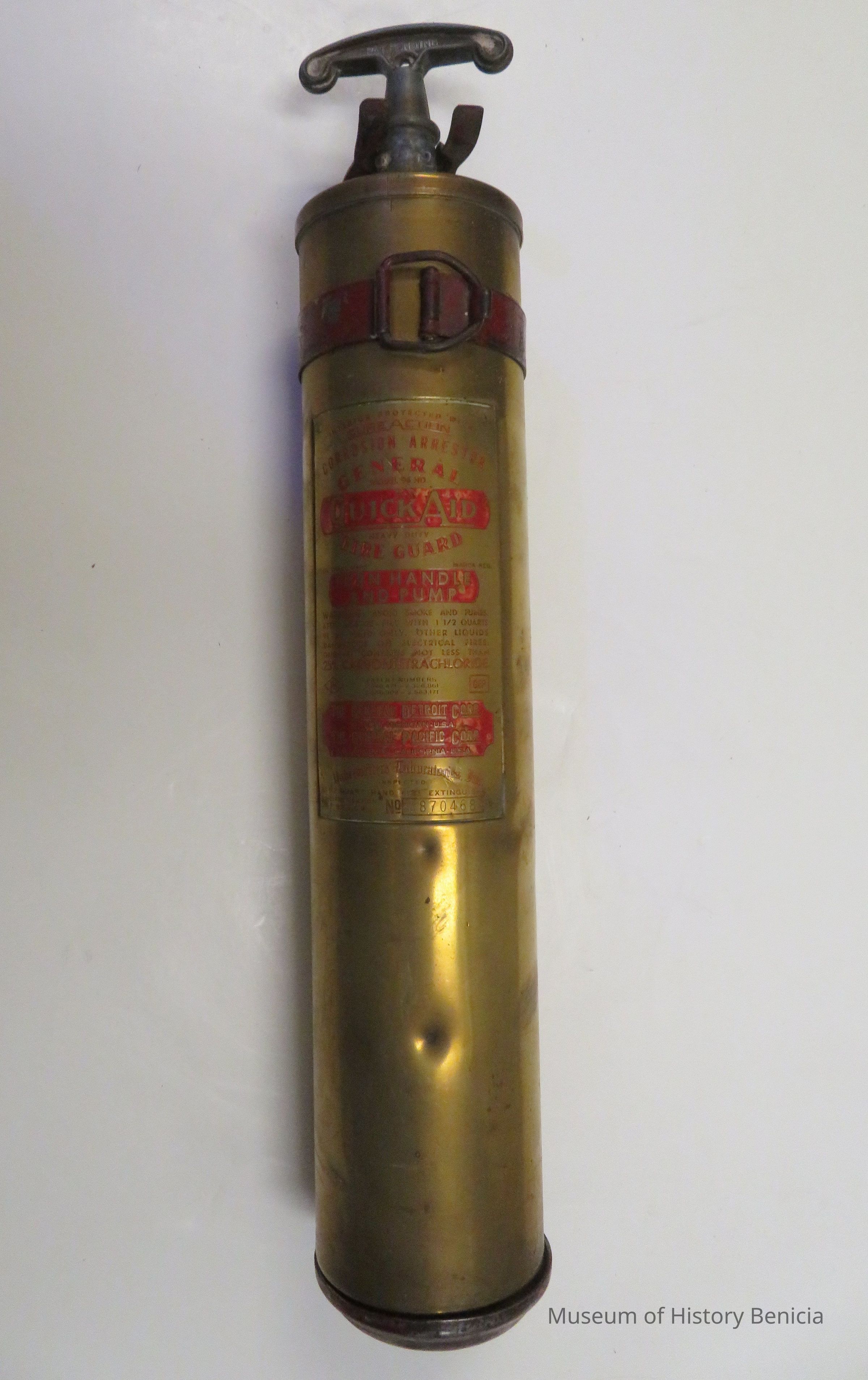 Goldish metal canister with red printing on front. The General Detroit Corp (Detroit, Michigan) and The General Pacific Corp. (Los Angeles, CA.) manufacturers of Quick Aid Fire Guard.Collection