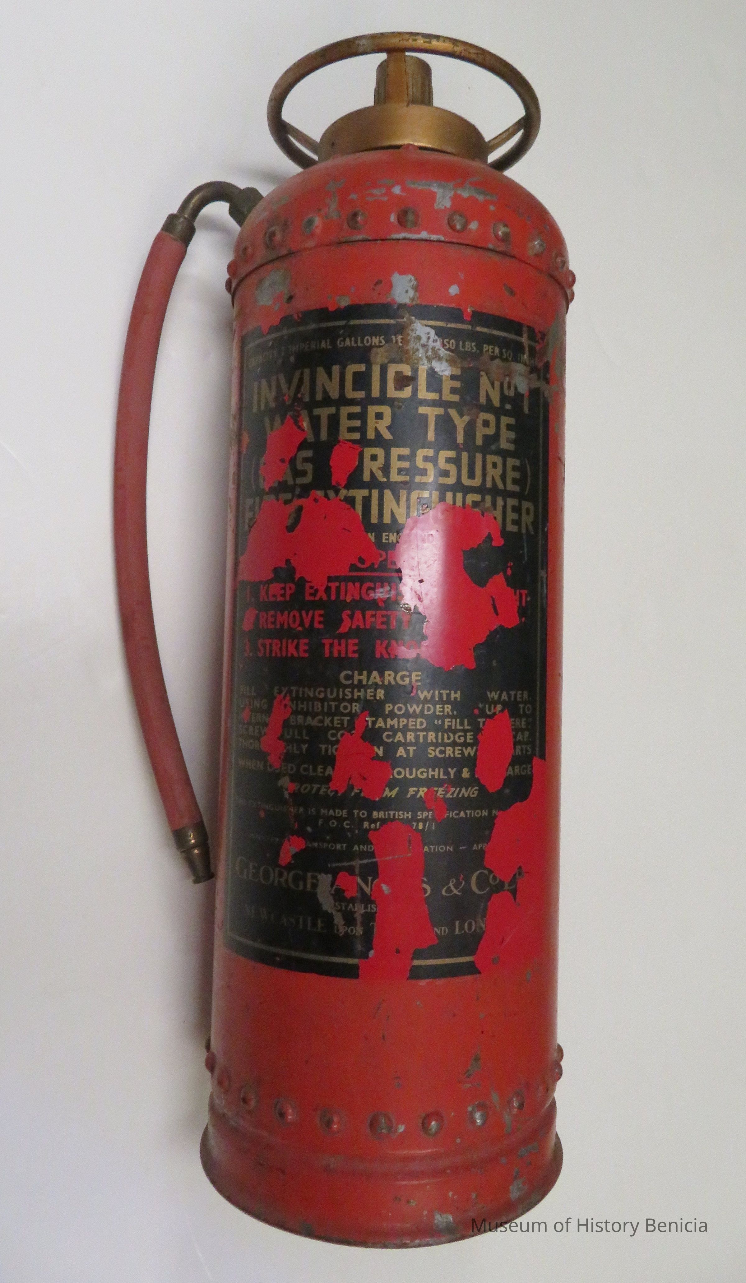 Red painted metal fire extinguisher. Treated to 350 lbs., capacity is 2 gallons.