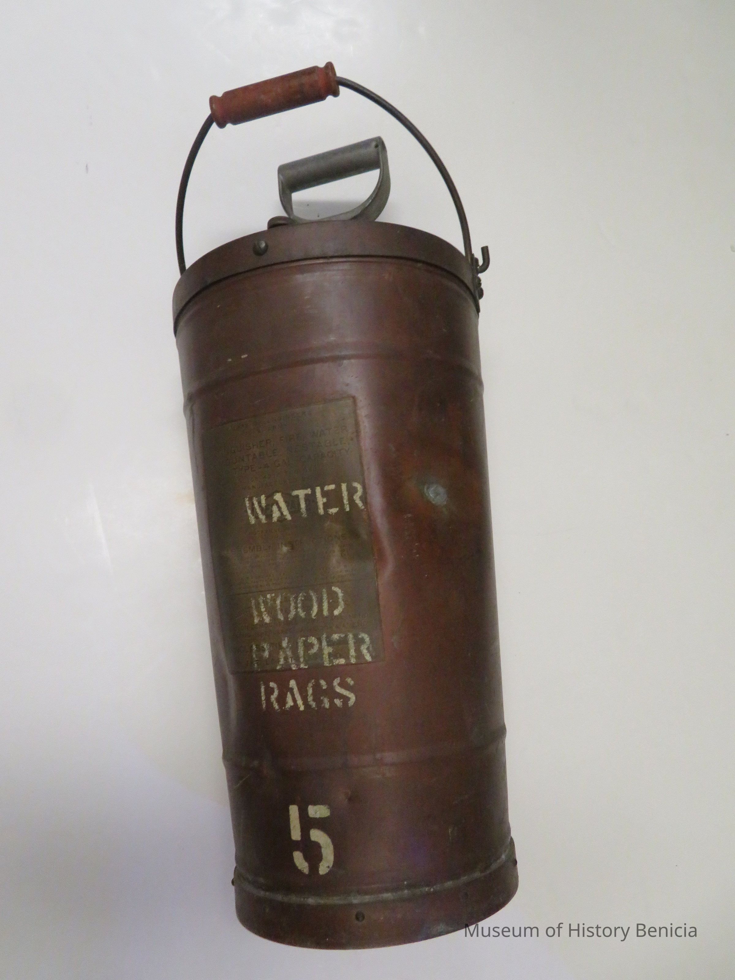 Copper-like fire extinguisher with wood handle. It reads "Water, wood, paper, rags and the number 5."
